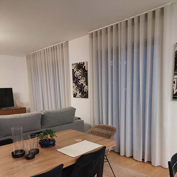 O tecido escolhido foi o Varosa, uma combinação de linho e poliéster, as cortinas têm uma textura natural e transparência delicada que filtra a luz suavemente, criando uma atmosfera acolhedora e íntima. O tecido oferece não só uma estética de elegância discreta mas também uma funcionalidade excelente, assegurando privacidade e controle de luz com um movimento suave e preciso.