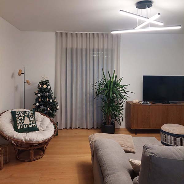 Na Mi Kasa Su Kasa, especializamo-nos na confeção e instalação de cortinados por medida, garantindo um encaixe perfeito e um visual esteticamente agradável para a sua casa. A sala transforma-se com a adição dos cortinados, a combinação de cores e texturas harmoniza-se perfeitamente com o ambiente tranquilo e moderno.