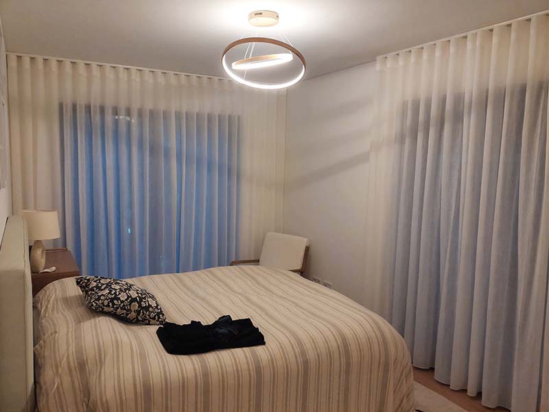 O quarto é um santuário de tranquilidade, realçado pela escolha perfeita destes cortinados. O tecido selecionado em tons suaves cria uma sensação de calma e serenidade, perfeita para um ambiente destinado ao repouso.