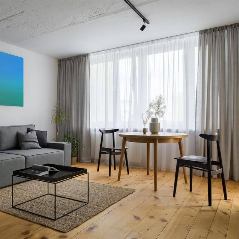 Ou pode renunciar completamente a um sofá e, em vez disso, optar por um sofá fino ou mesmo um banco, para evitar trazer objetos visualmente pesados como sofás volumosos.