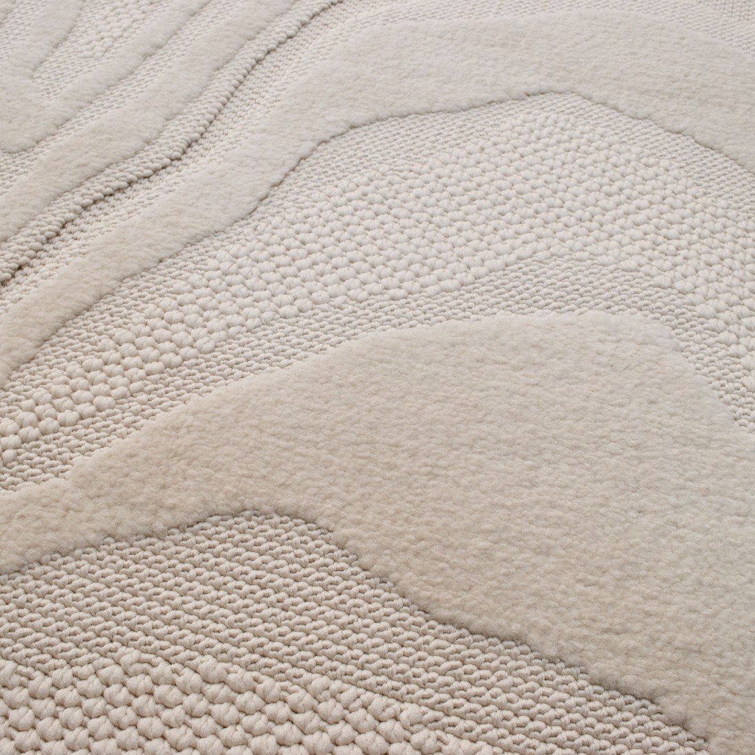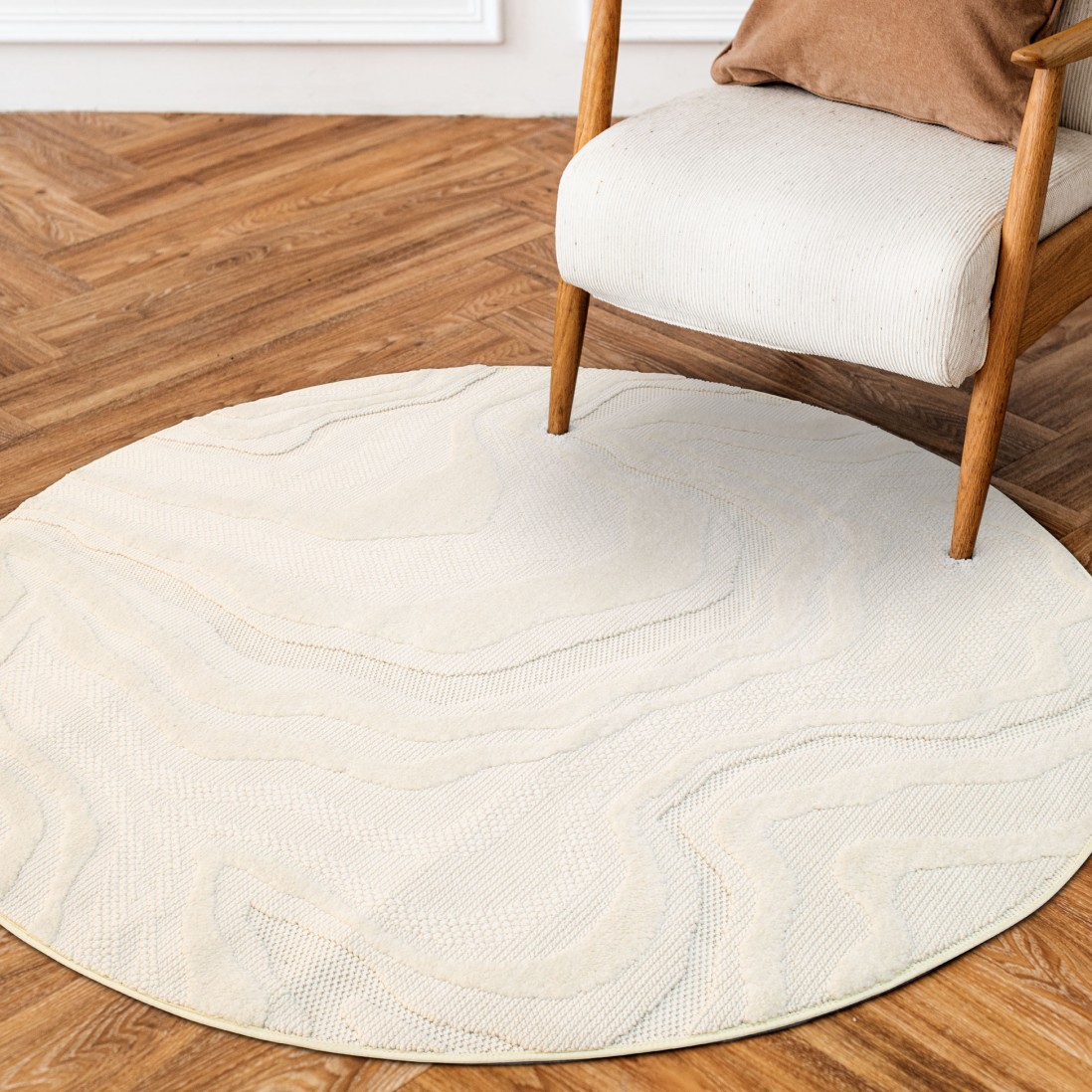 O padrão orgânico inspirado no movimento das ondas confere dinamismo e sofisticação ao ambiente. Na versão redonda, as linhas fluidas ganham ainda mais destaque, criando um ponto decorativo harmonioso ideal para salas, zonas de leitura ou junto a mesas de centro.