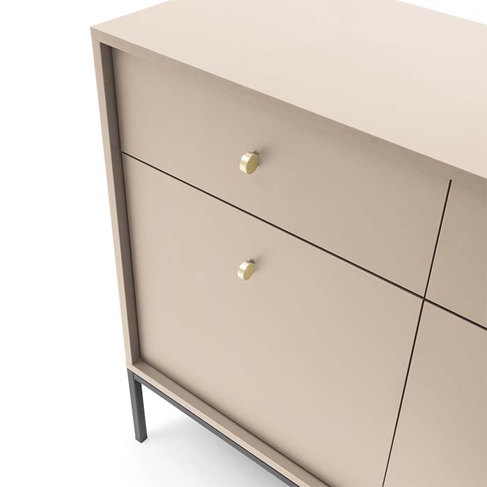 Aparador bege suave com linhas retas e um design minimalista. Puxadores dourados dão um toque de elegância.
