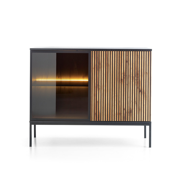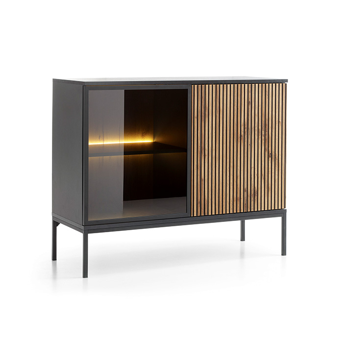 Aparador moderno que combina madeira com ripas em preto. Design minimalista com linhas retas e uma estrutura em metal preto.