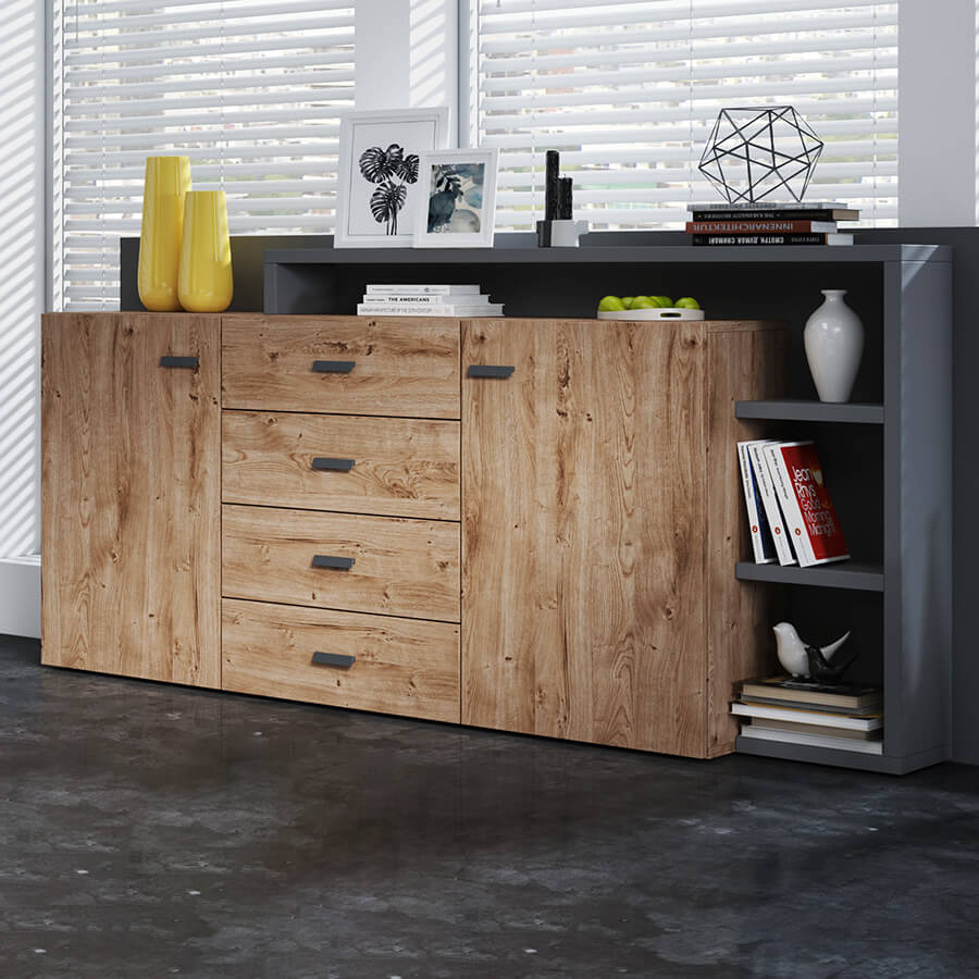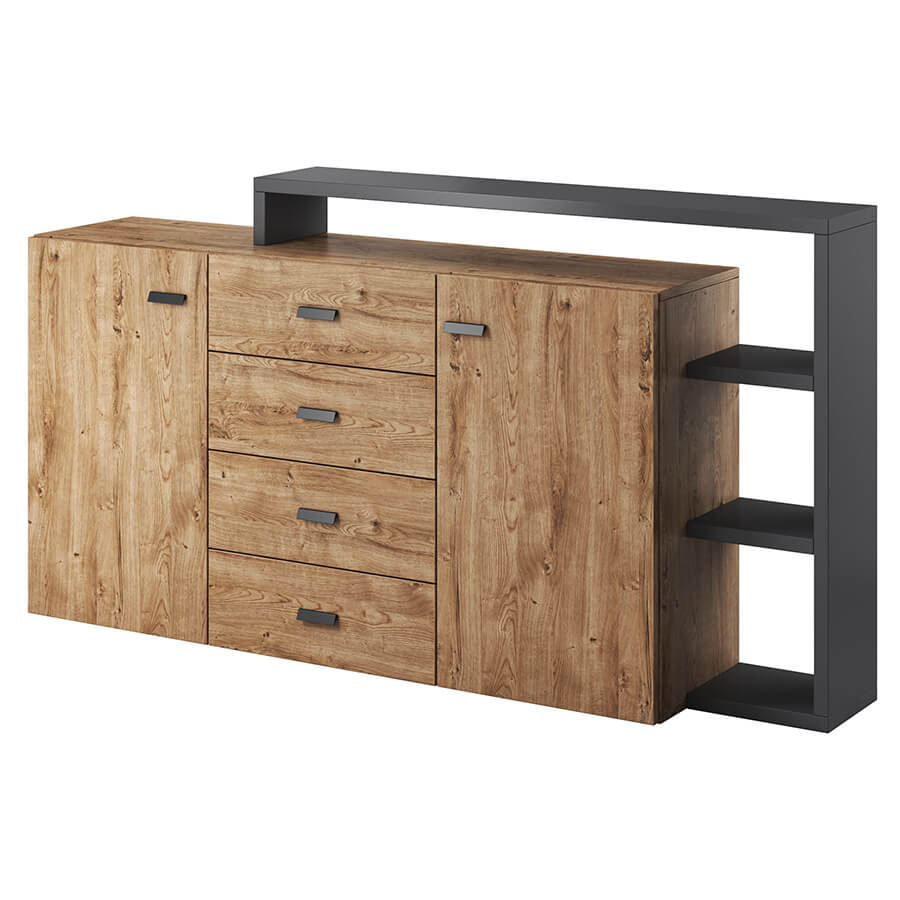 Aparador com duas portas, quatro gavetas e estante lateral Bota é uma proposta com formas assimétricas, criando uma unidade de sala de estar única, combinam funcionalidade com arte moderna, que desempenha um papel importante em interiores modernos.