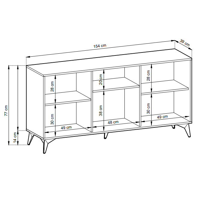 O aparador é suportado por pernas finas e angulares que dão uma sensação de leveza e elegância.