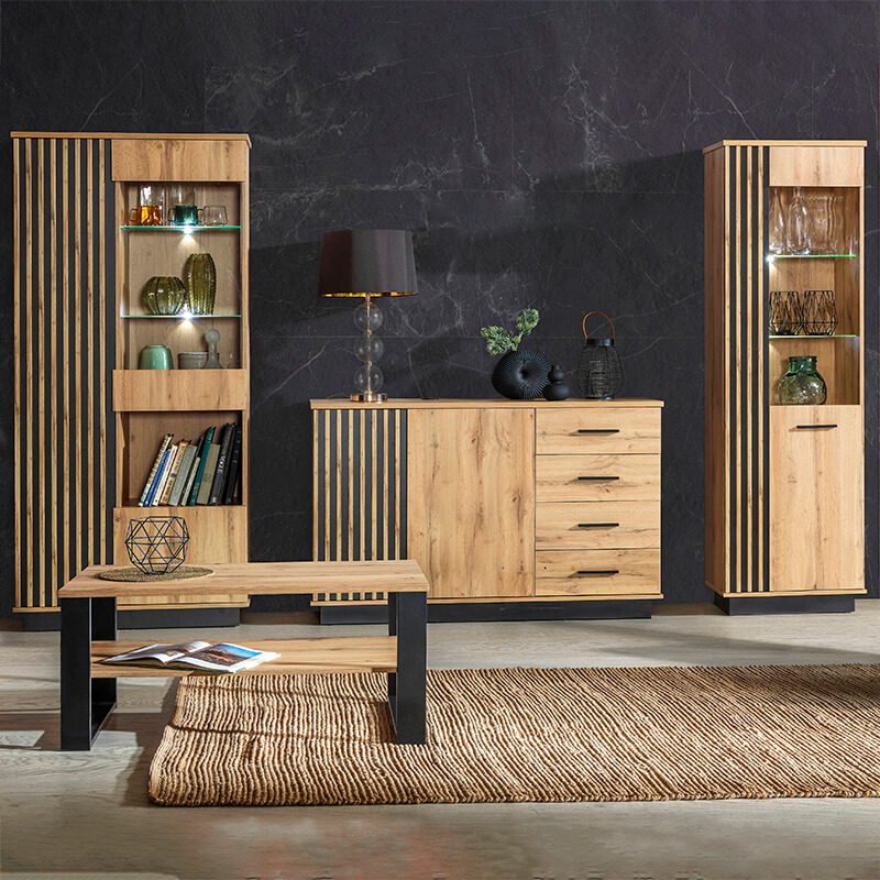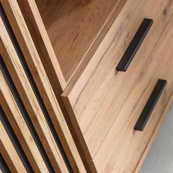 O mobiliário Lamelo é caracterizado por um design moderno e elegante. As frentes são uma combinação de carvalho wotan, preto fosco e painéis ripados que se harmonizam perfeitamente entre si.