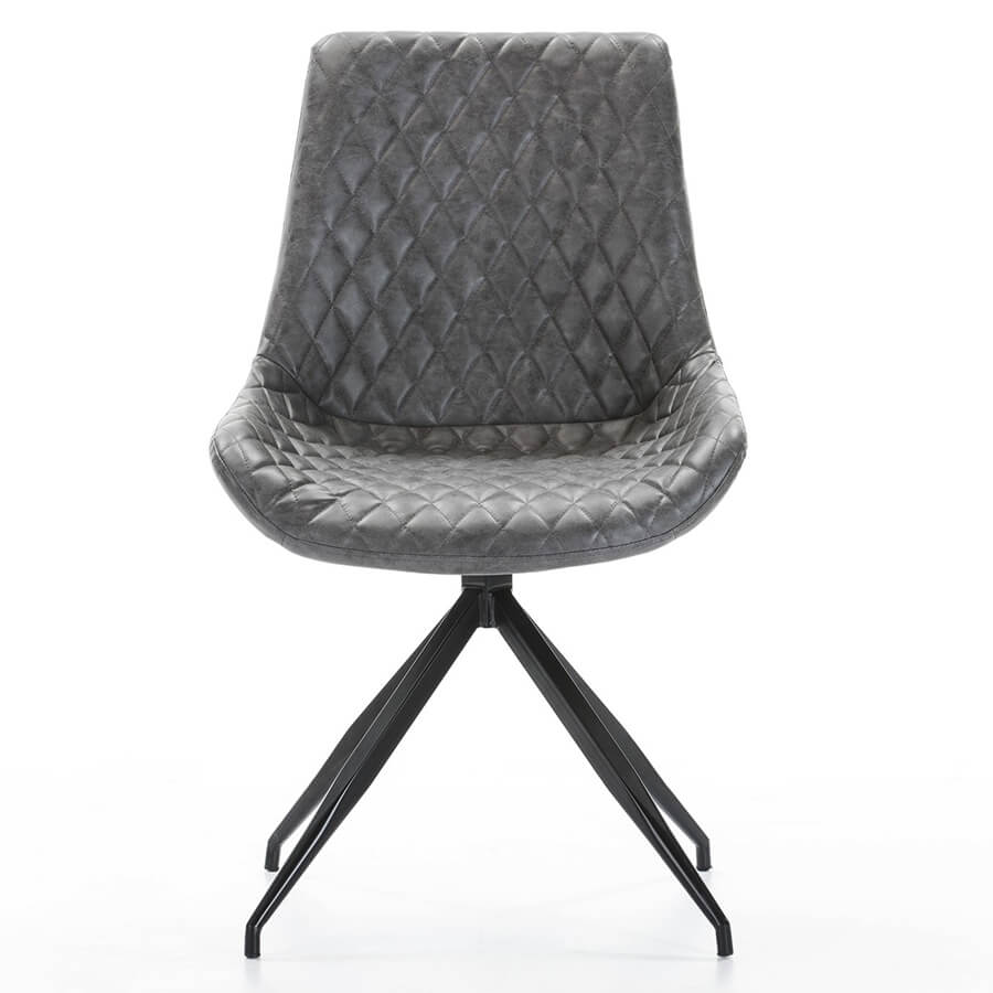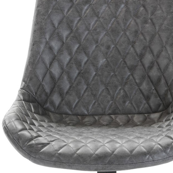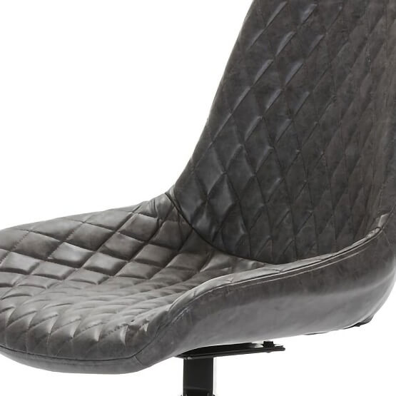Uma cadeira giratória estofada em couro sintético nas costas e frente, com pernas de aço em preto. Assento acolchoado estofado cinzento com padrão em losango combinado com couro ecológico castanho de alta qualidade.