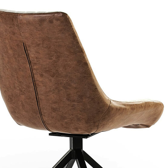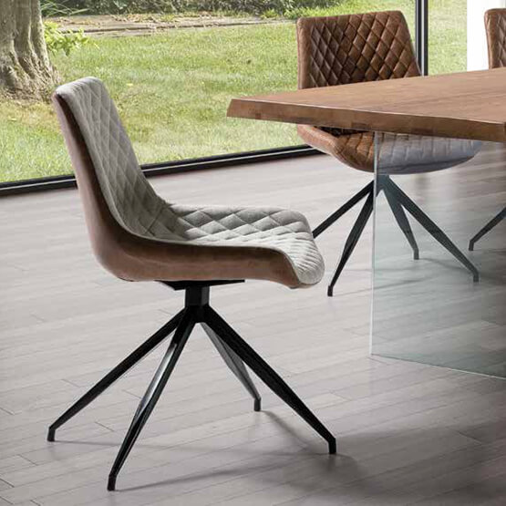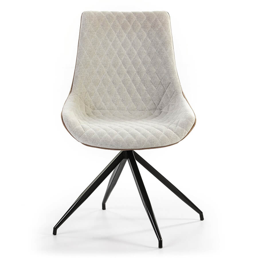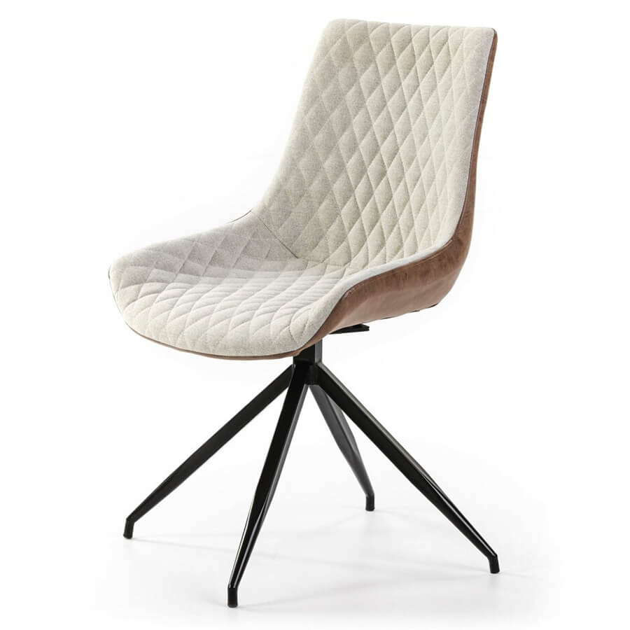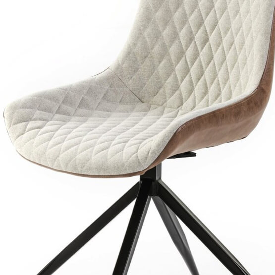 Uma cadeira giratória estofada em couro sintético nas costas e em tecido na frente, com pernas de aço em preto. Assento acolchoado estofado em tecido bege com padrão em losango combinado com couro ecológico castanho de alta qualidade.