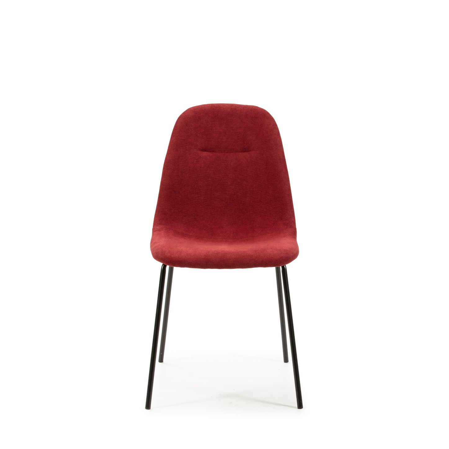 É leve, simples e adaptável a diferentes ambientes. Com tecido suave vermelho que envolve todo o assento, base metálica lacado a preto com elemento diferenciador de design. Para um conforto satisfatório, é usada espuma de alta qualidade.