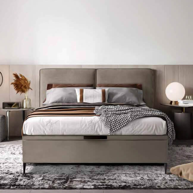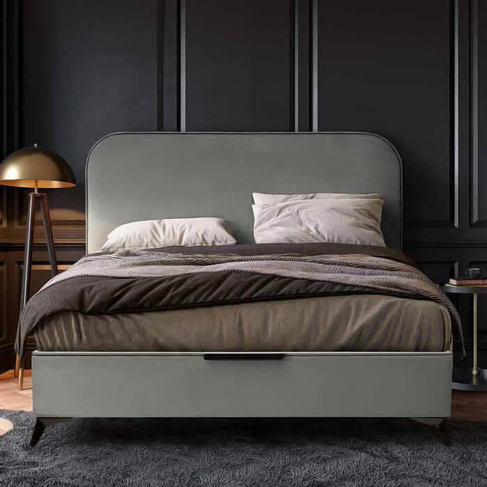 Esta cama estofada com sommier elevatório é perfeita para arrumar mantas, roupões, édredons, lençóis e outros complementos, que roubam espaço às gavetas e aos roupeiros.