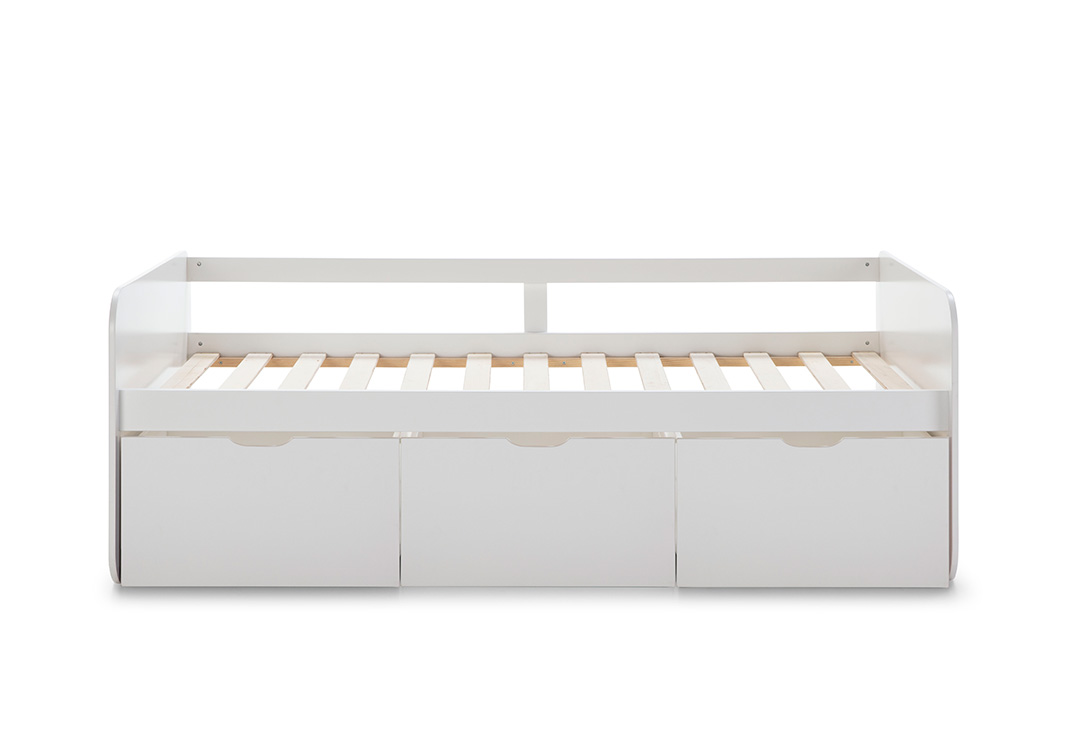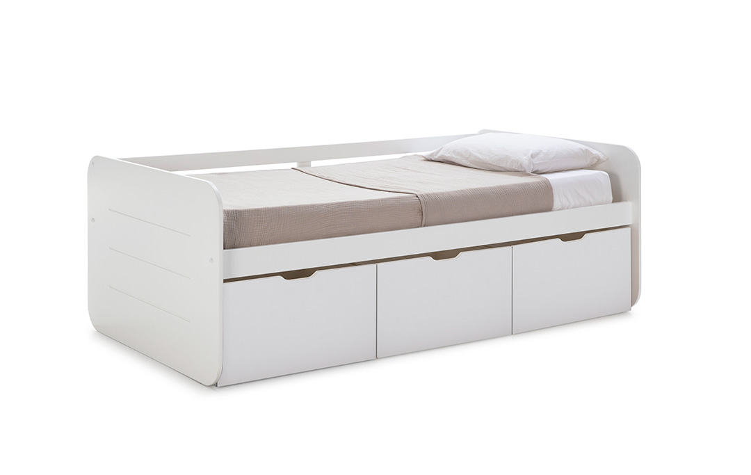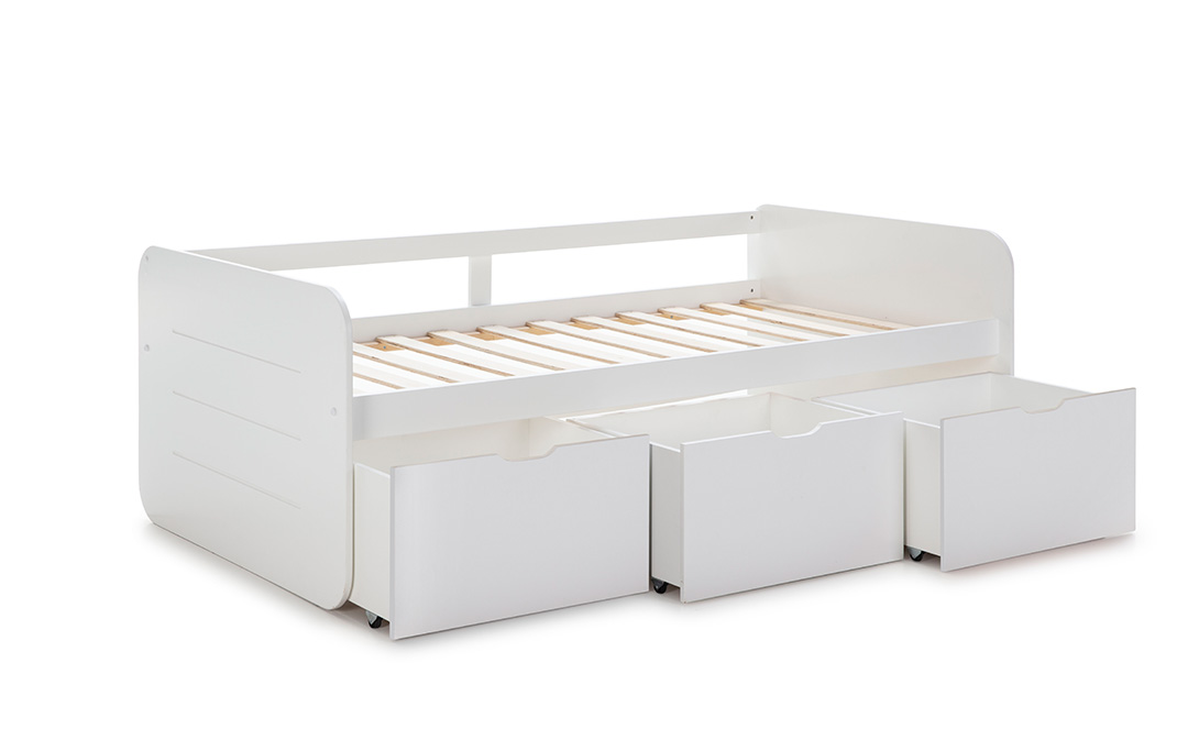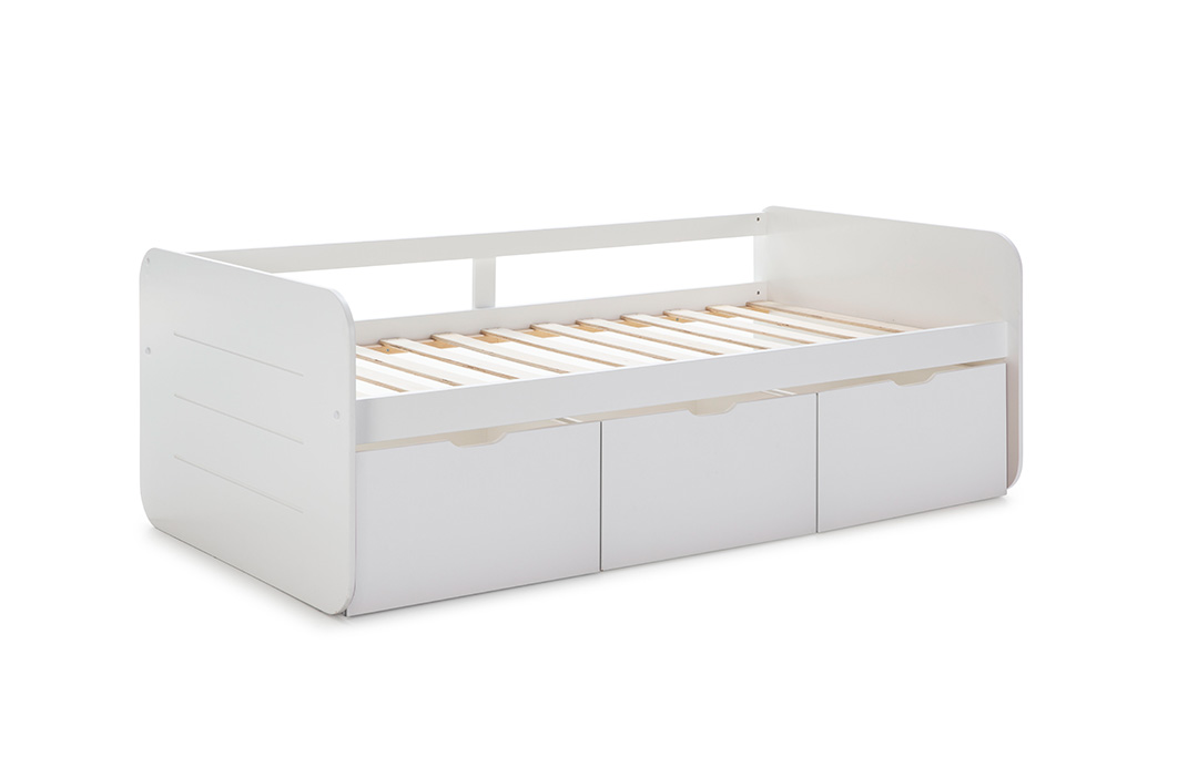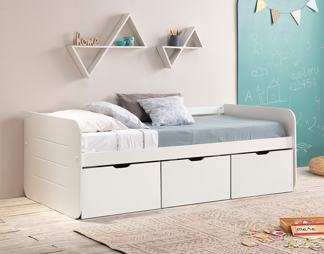 • Cama com estrutura resistente. • Gavetas deslizantes integradas para arrumação. • Design compacto ideal para poupar espaço • Adequada para colchão de 90x190 cm (não incluído). • Ideal para crianças a partir dos 3 anos.