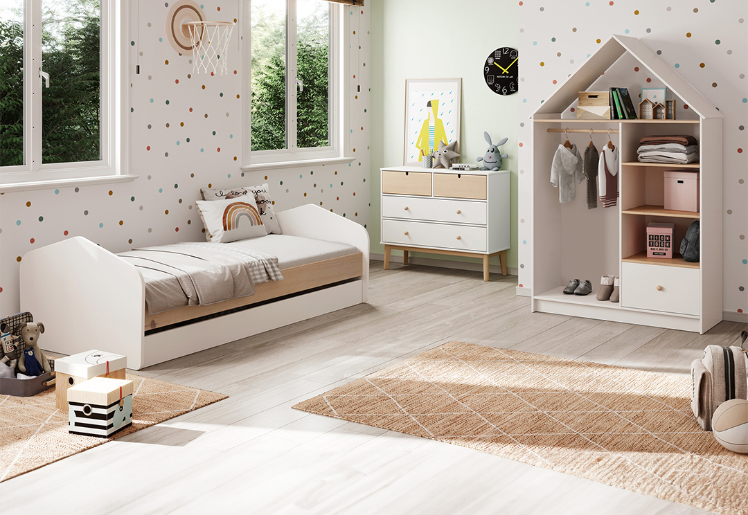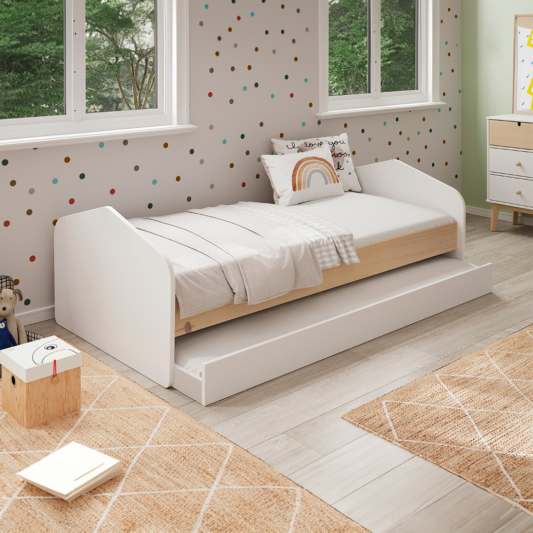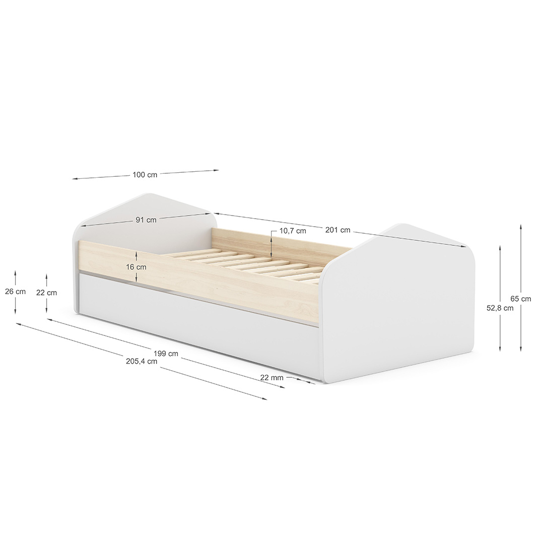 • Cama dupla com estrutura resistente. • Gaveta deslizante integrada para arrumação ou cama extra. • Design moderno com mistura de branco e madeira natural. • Adequada para colchão de 90x200 cm ou 90x190 cm (não incluído). • Ideal para crianças a partir dos 3 anos.