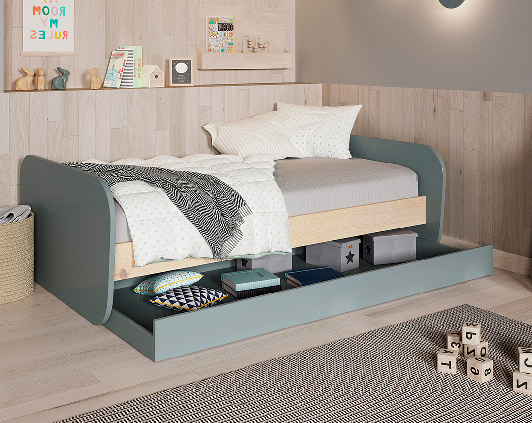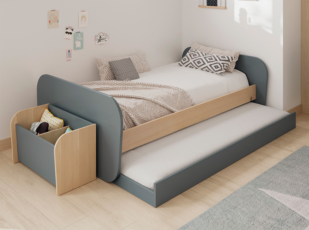 Esta cama versátil resolve o problema de acomodação para dois, oferecendo uma cama principal e uma cama extra deslizante.
