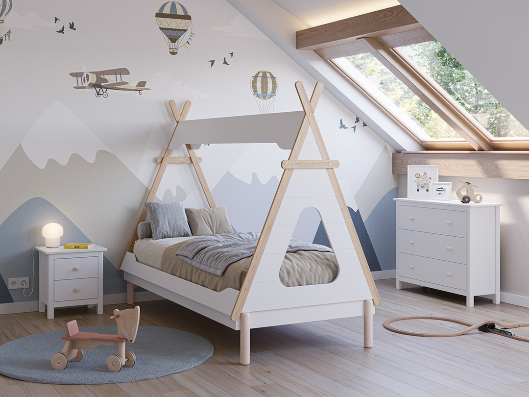 A Cama Tenda Tipi transforma o quarto da criança num cenário de aventuras, combinando o charme de uma tenda indígena com o conforto de uma cama moderna. Fabricada em pinho e num elegante tom branco, esta cama única cria um espaço acolhedor e estimulante para o descanso e a brincadeira.