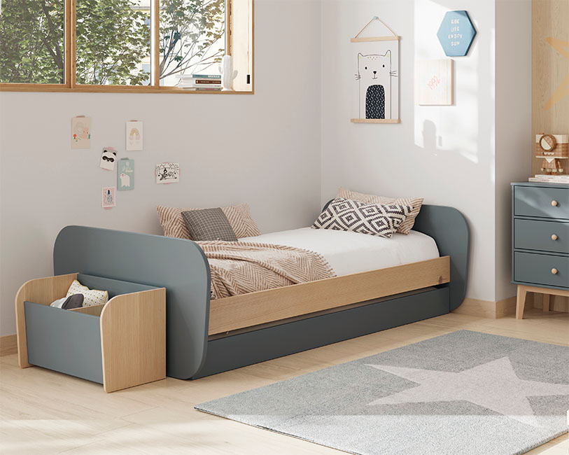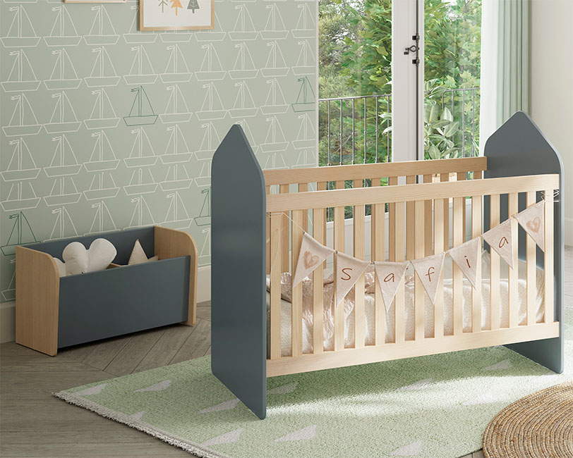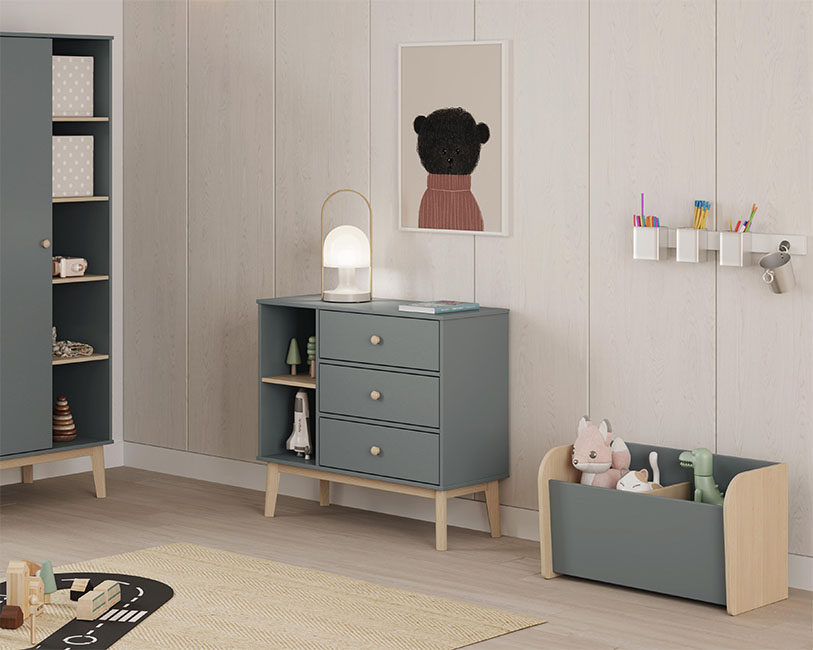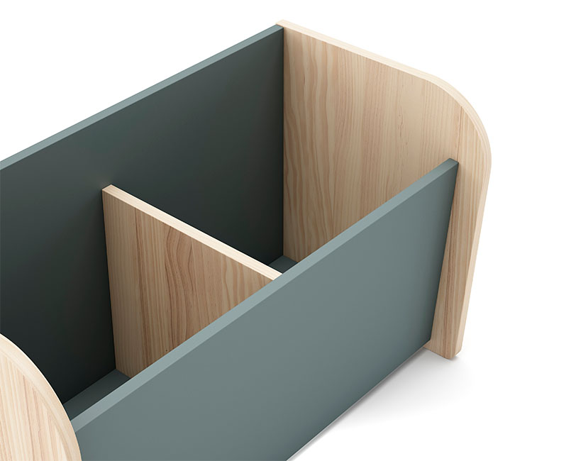 Este robusto baú combina madeira natural com painéis verdes, oferecendo durabilidade e facilidade de limpeza para o dia-a-dia agitado das famílias.