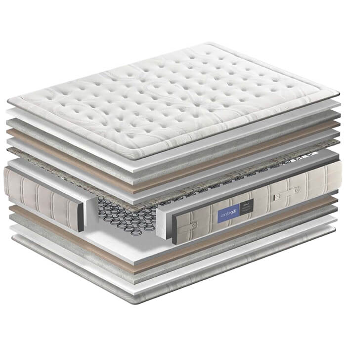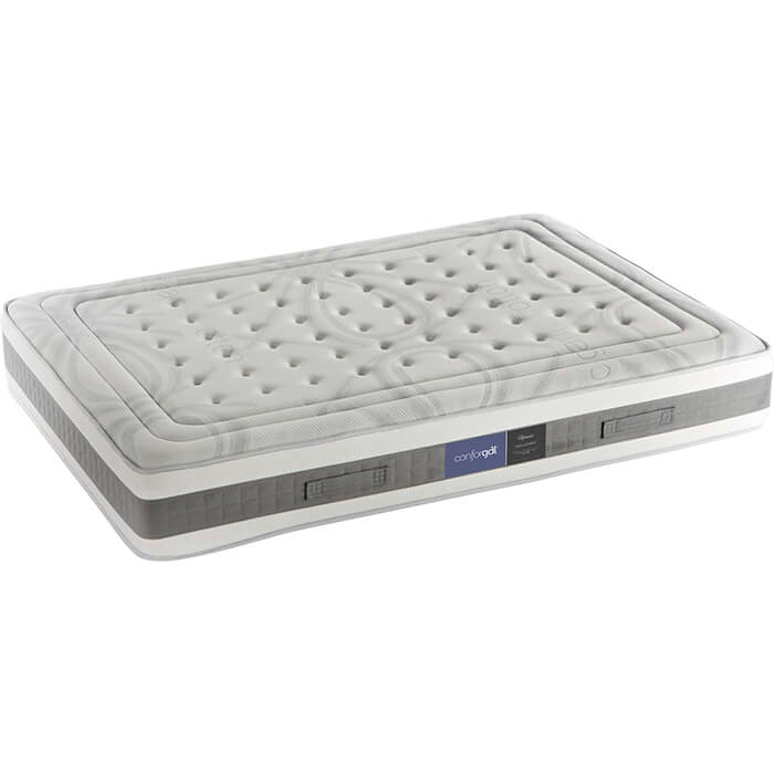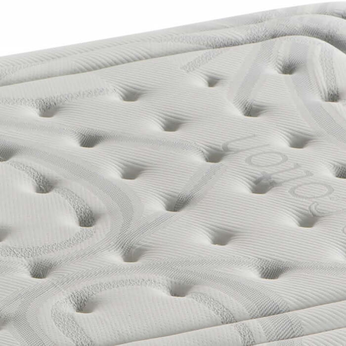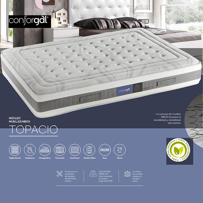 Tecido: elástico de alta qualidade com tratamento anti-ácaro; Camada de fibra hipoalergénica; Camada de viscografeno; Camada Termosoft; Camada de Conforsuit de alta densidade de 30kg/m3; Almofada selada a quente; Sistema: NBox invólucro de mola com rosca 2.3; Reforço: perimetral de 8cm de 50kg/m3 contra deformações lateriais; Plataforma acolchoada com chenille; Alças laterais e frontais costuradas à mão.