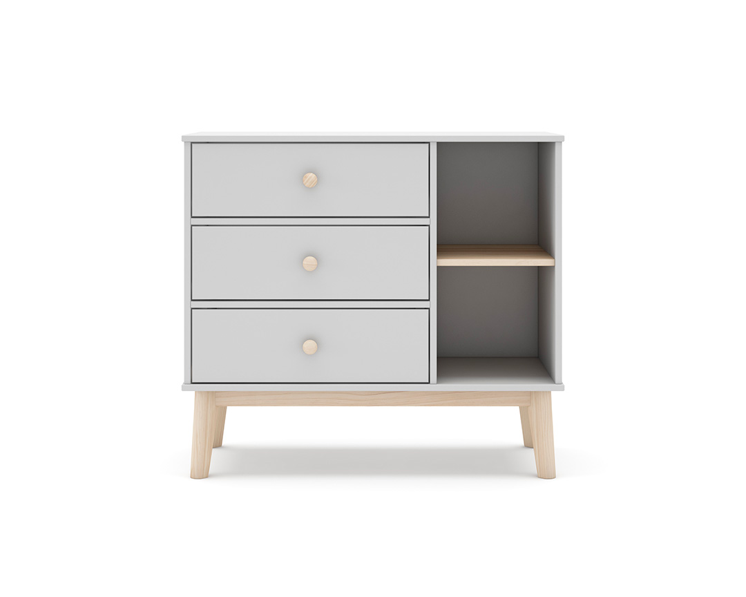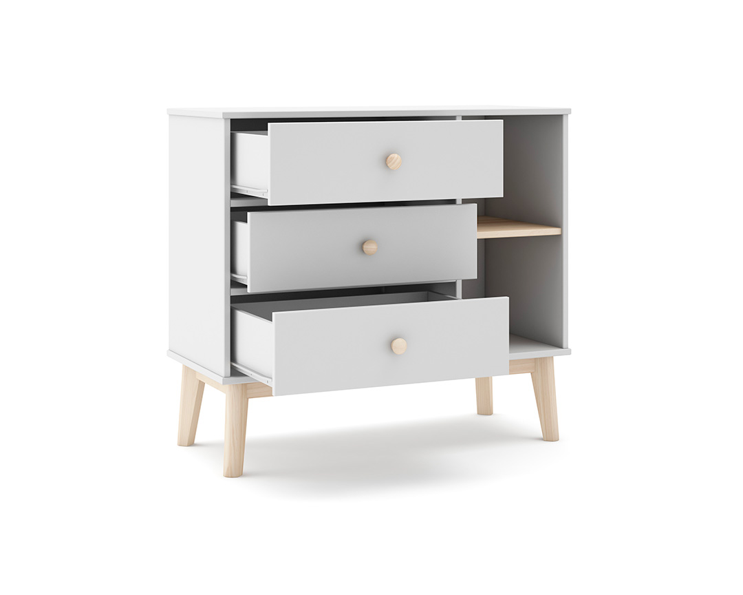 Cómoda branca para quarto de criança com 3 gavetas e estante. Pés em madeira para estabilidade. Ideal para arrumar roupas, brinquedos e livros.