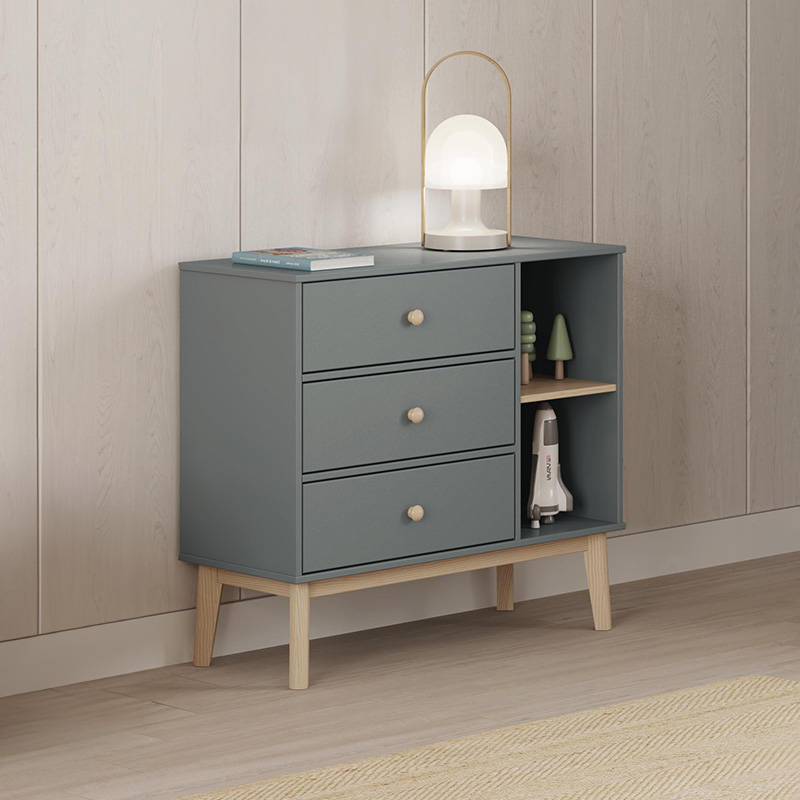 • 3 gavetas com puxador • Estante integrada • Cor verde fácil de limpar • Pés em madeira resistentes • Adequada para quartos pequenos • Montagem simples • Materiais de qualidade