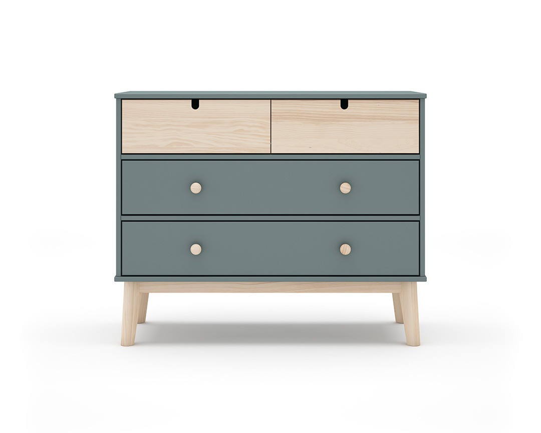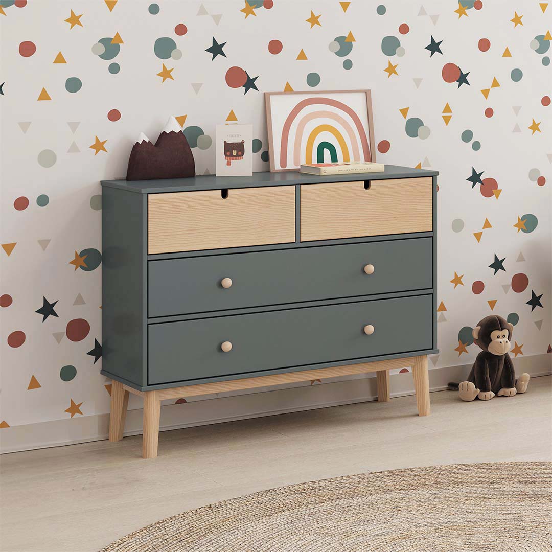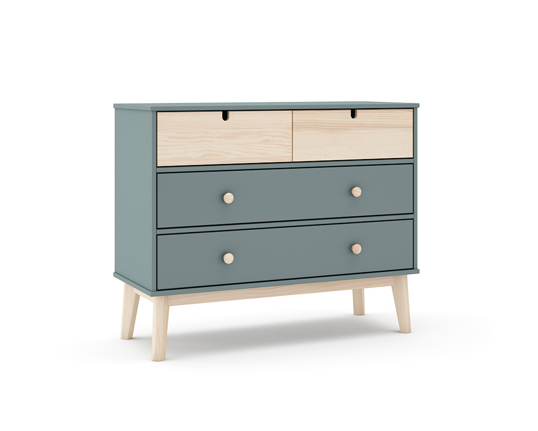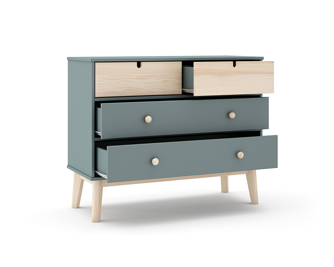 Cómoda verde para quarto de criança com quatro gavetas. Pés em madeira para estabilidade. Ideal para arrumar roupas, brinquedos e livros.