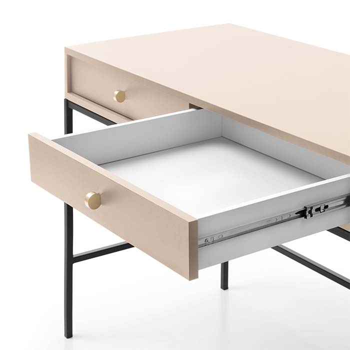 O tampo e as gavetas apresentam uma cor bege suave, harmonizando-se com a tonalidade dourada da estrutura.