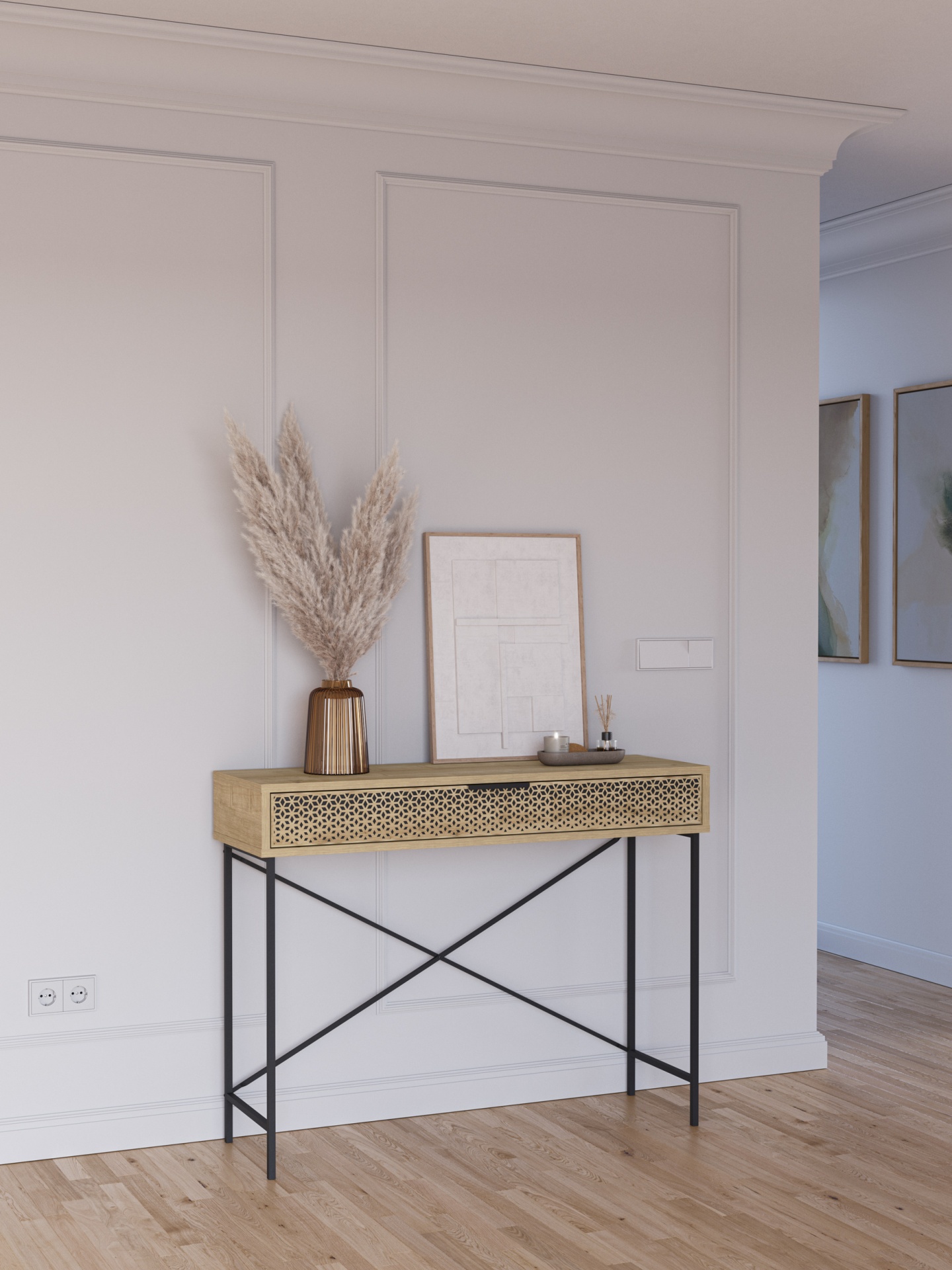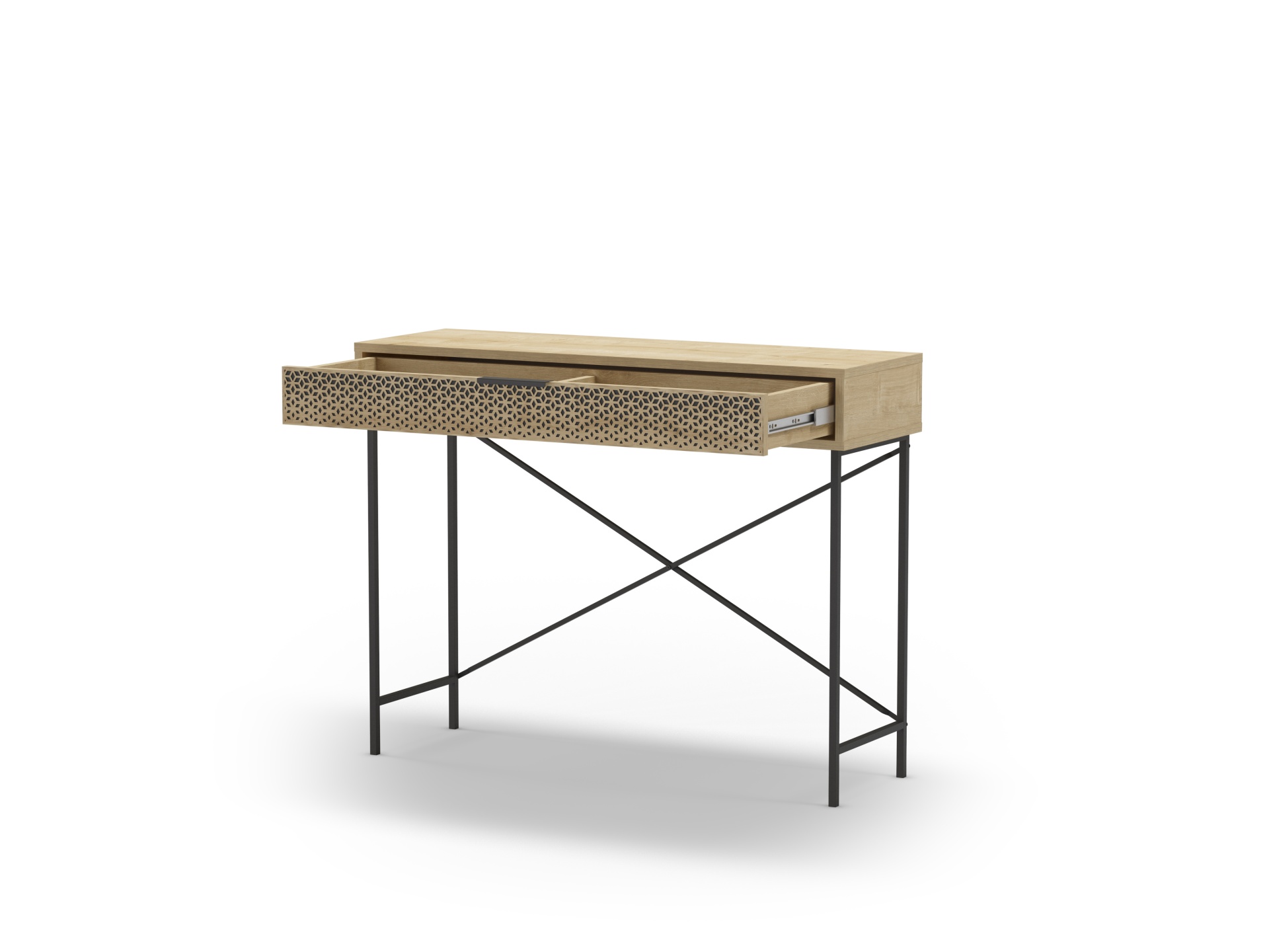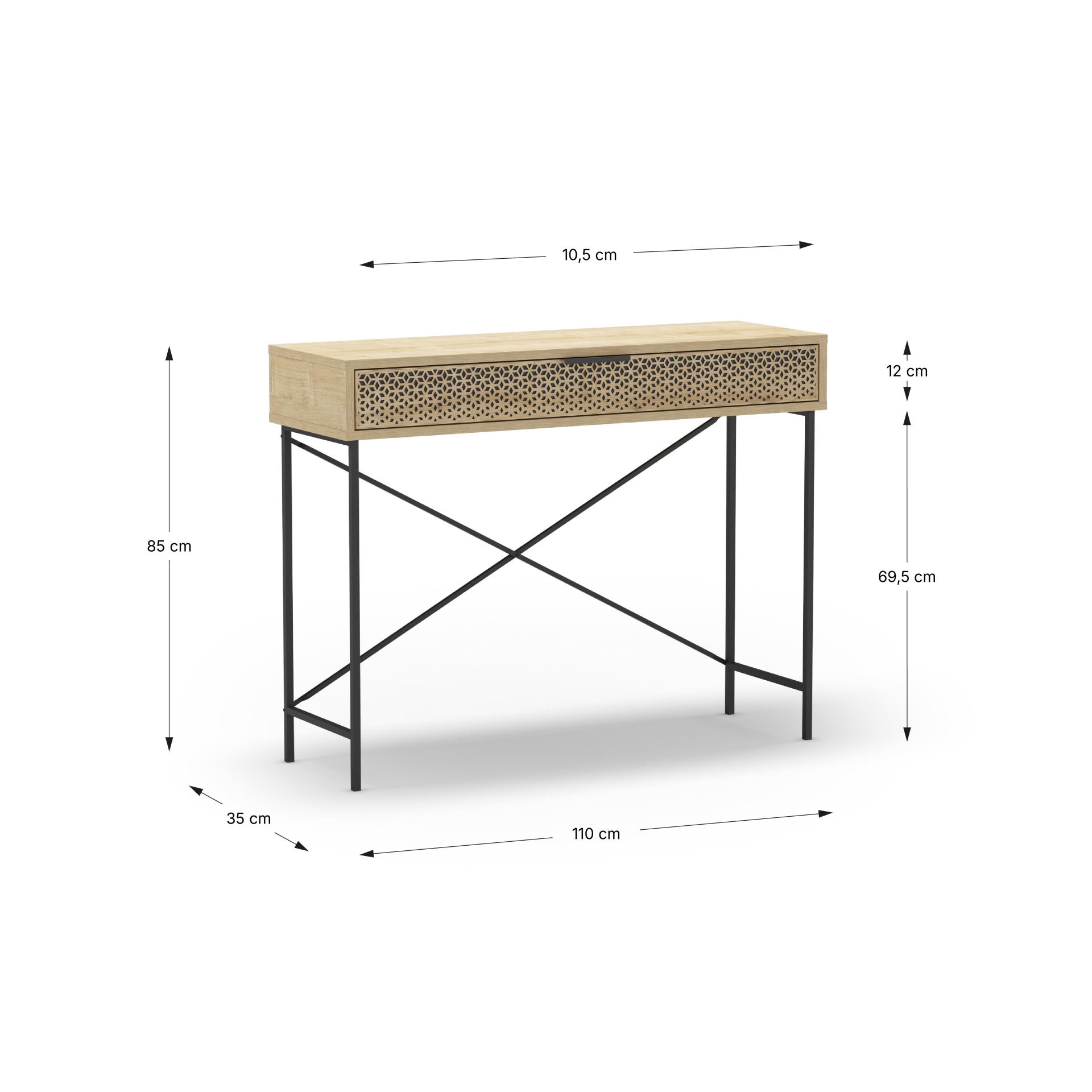 Consola excelente para hall de entrada ou corredor, feito de metal e melamina de forma a deixar uma estrutura forte e duradoura. Coloque-o por baixo de um espelho ou um quadro e tenha um lugar onde colocar objetos que leva para todo o lado como chaves ou carteira.