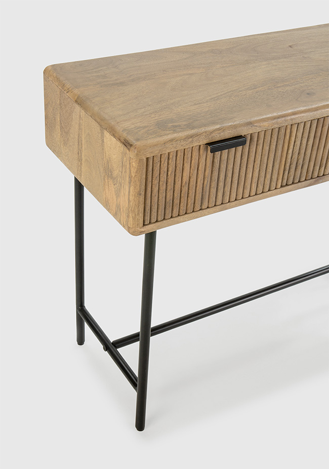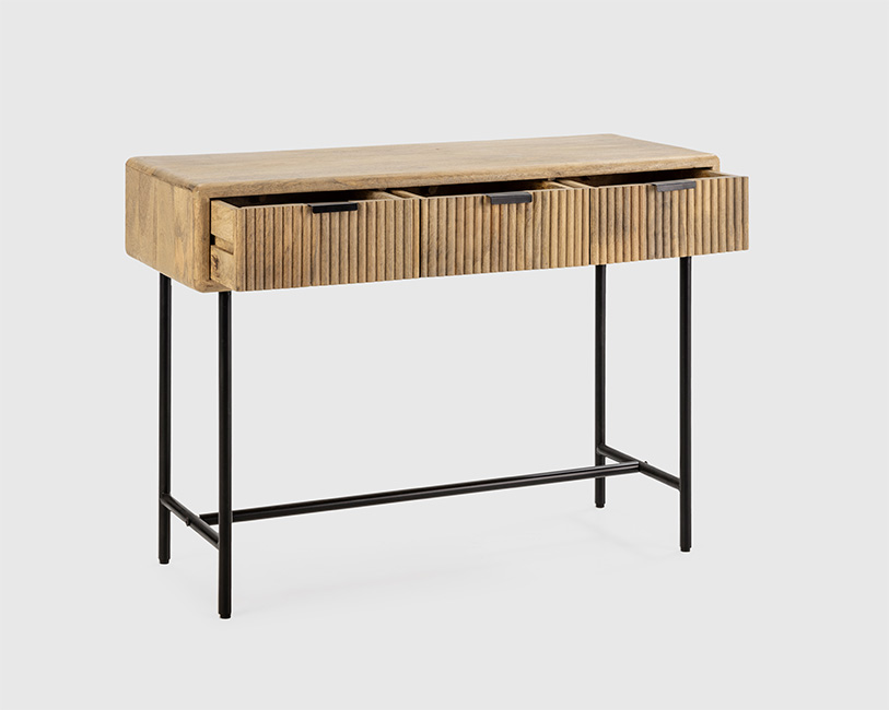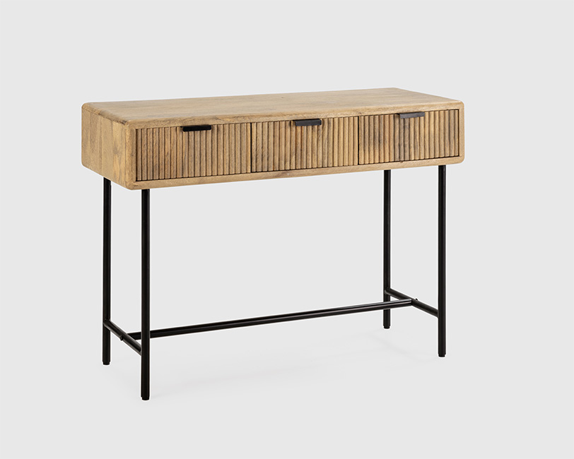• Tampo em madeira maciça natural • Estrutura em metal preto resistente • Três gavetas espaçosas com frente ripada • Puxadores embutidos para um visual limpo • Design versátil adequado para entradas • Construção robusta para durabilidade a longo prazo