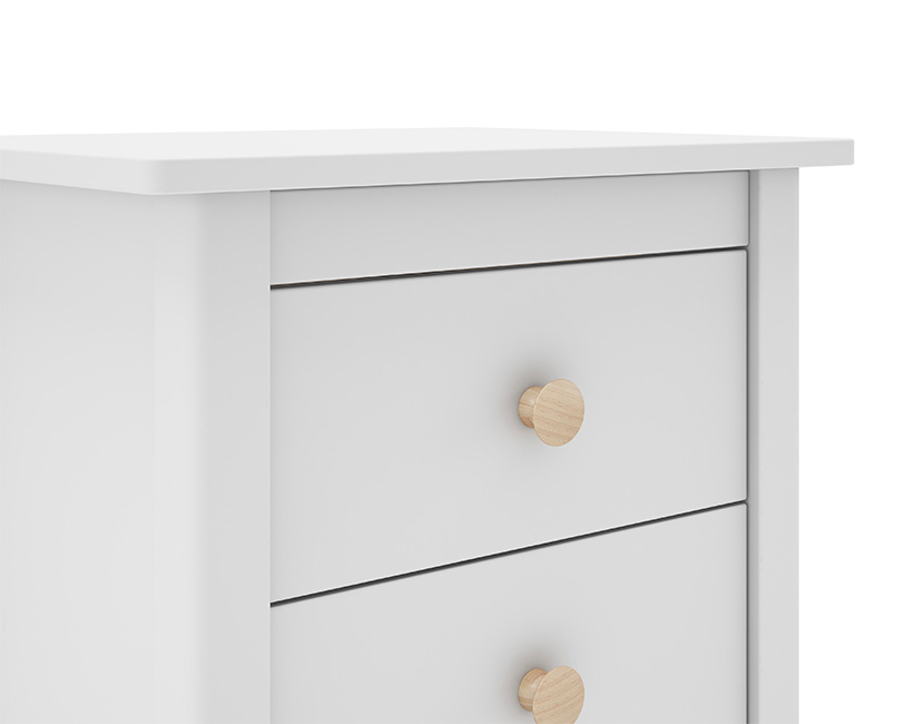 • Material: MDF lacado • Cor: Branco • 3 gavetas • Puxadores em madeira natural • Pés robustos para estabilidade • Design minimalista e versátil • Ideal para quartos de criança • Fácil montagem e manutenção