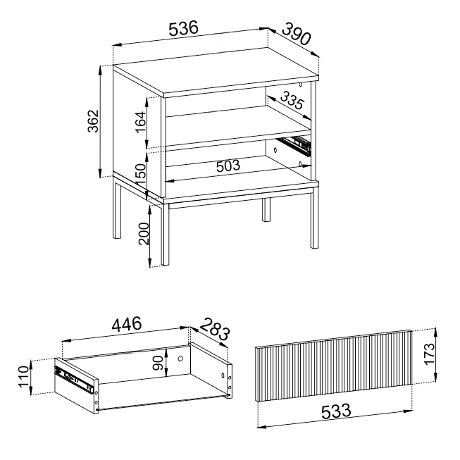 - Acabamento em Carvalho com ripas, tampo e pés em preto.