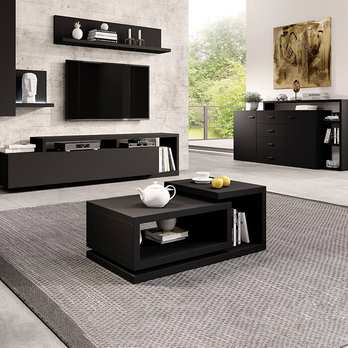 - MDF com acabamento folha de membrana. - A função de extensão total das gavetas facilita o acesso ao interior. - A folha de membrana de alta qualidade garante durabilidade por anos. - Mobiliário entregue em kit com instruções de montagem. - Acabamento em preto mate.