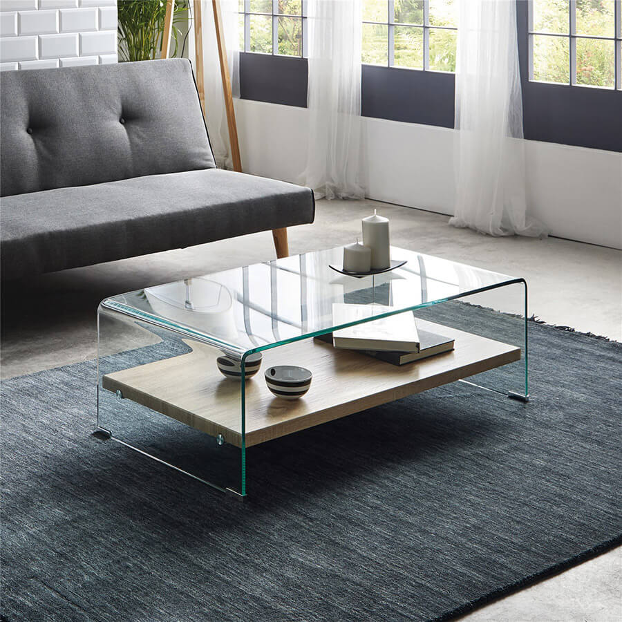 Mesa de centro em vidro temperado de 12 mm, com prateleira em madeira natural. Com os cantos arredondados para um sentido estético, esta peça é feita inteiramente de vidro e cria um apelo arejado no seu espaço.