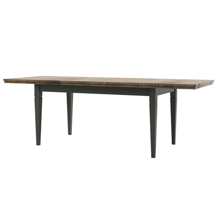 Mesa de jantar extensível acabamento em verde com tampo em carvalho. Três configurações possíveis, 160 cm, 200 cm e 240 cm.
