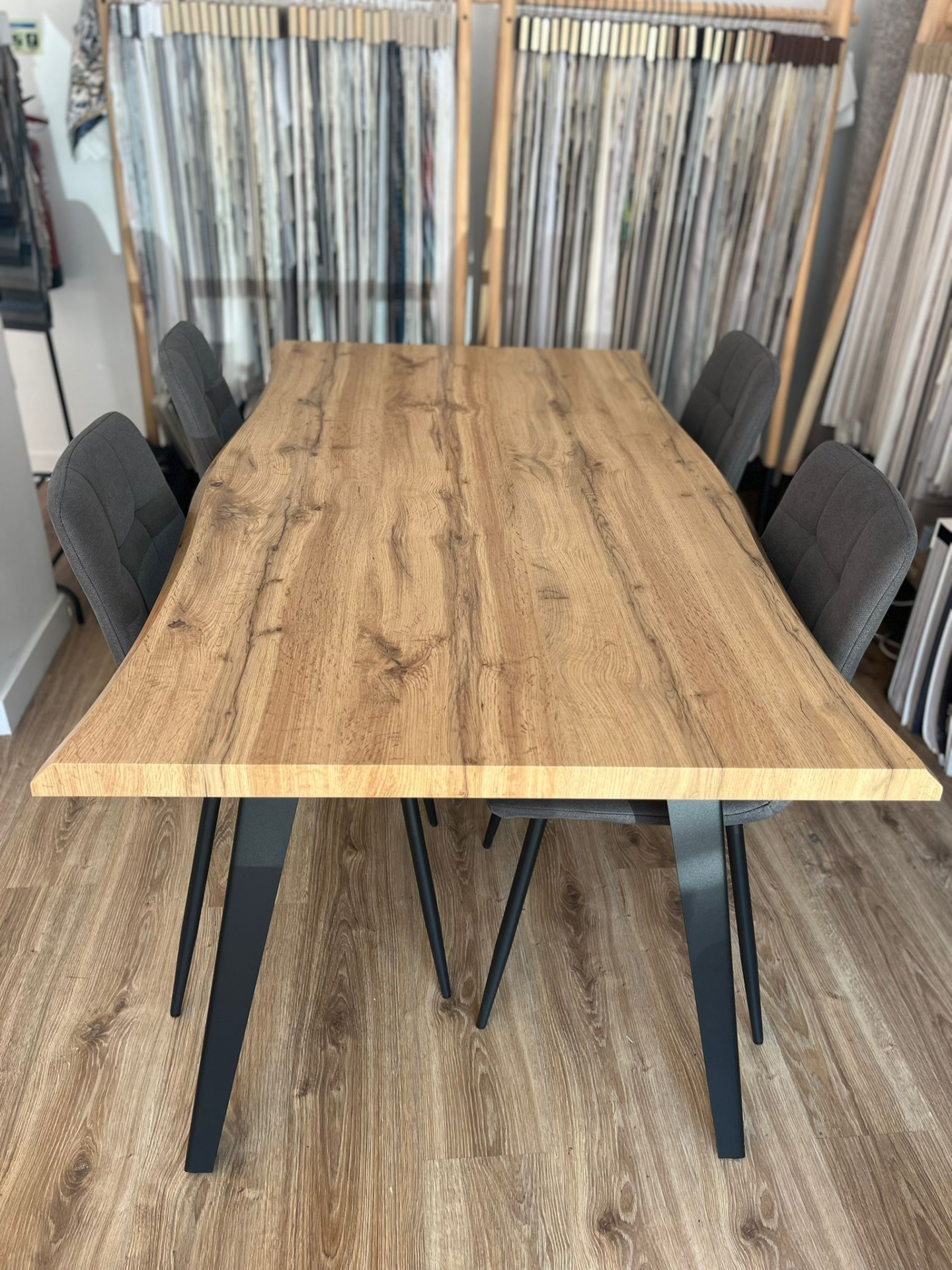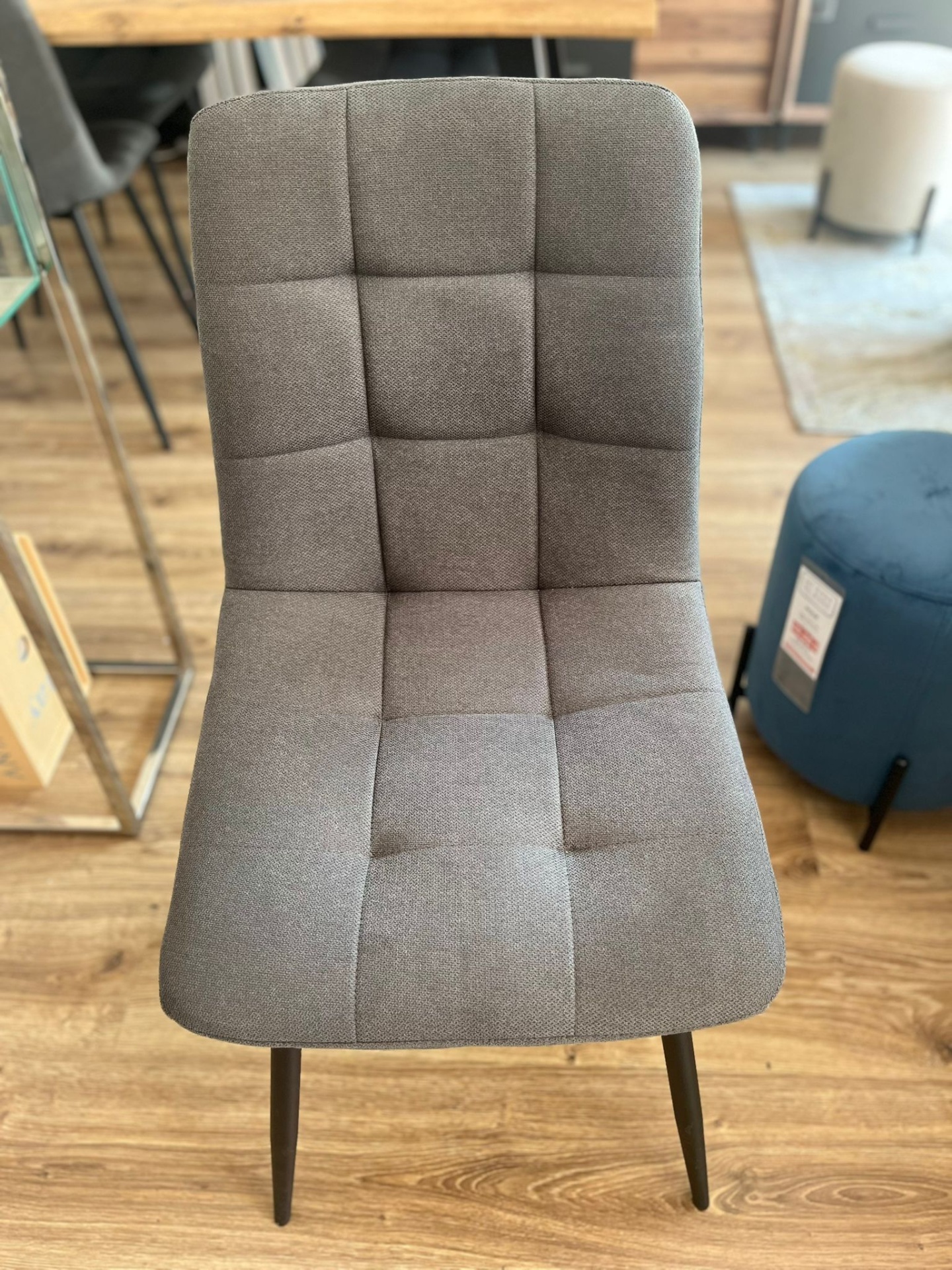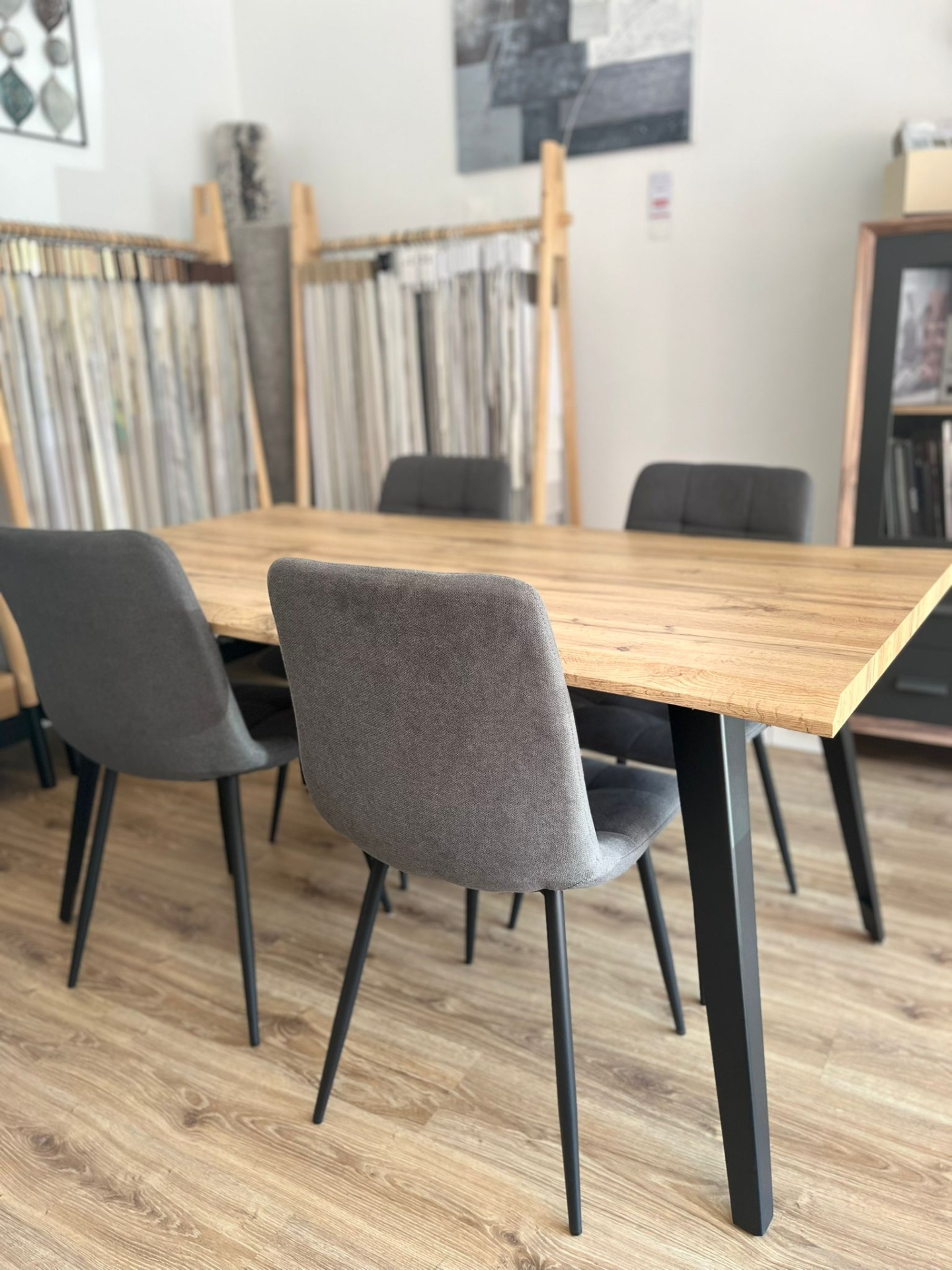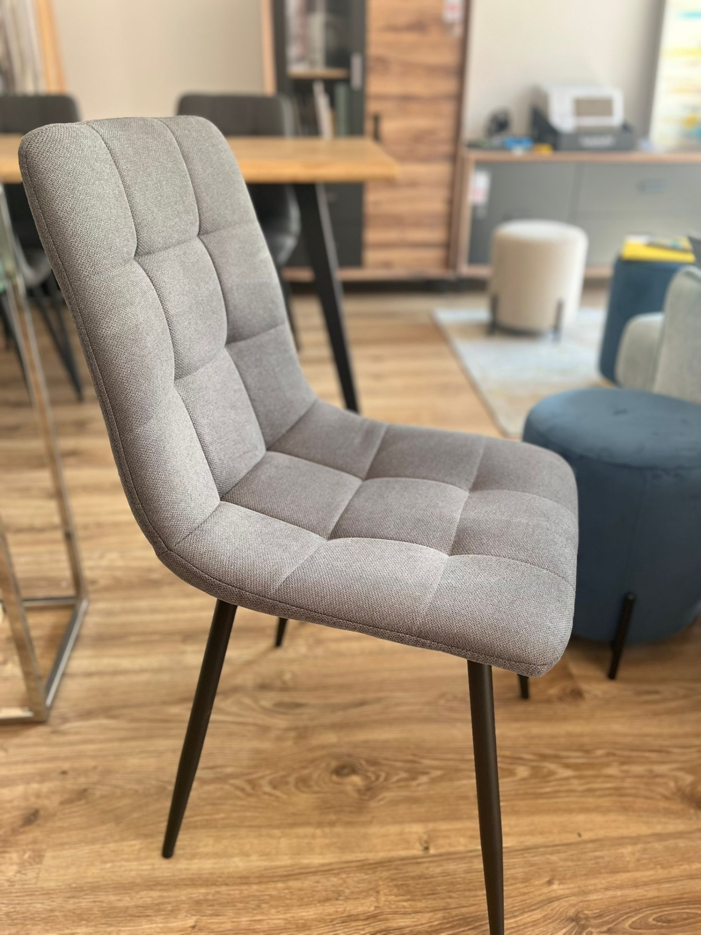 As quatro cadeiras que acompanham o conjunto têm um design minimalista, com têxteis em tecido cinzento que trazem um toque de sofisticação. As pernas em metal são perfeitamente coordenadas com os da mesa, criando uma harmonia estética e funcional.