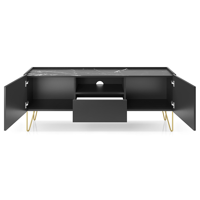 A frente do móvel tem várias secções: duas portas de abrir de cada lado e, ao centro, uma gaveta e um compartimento aberto.