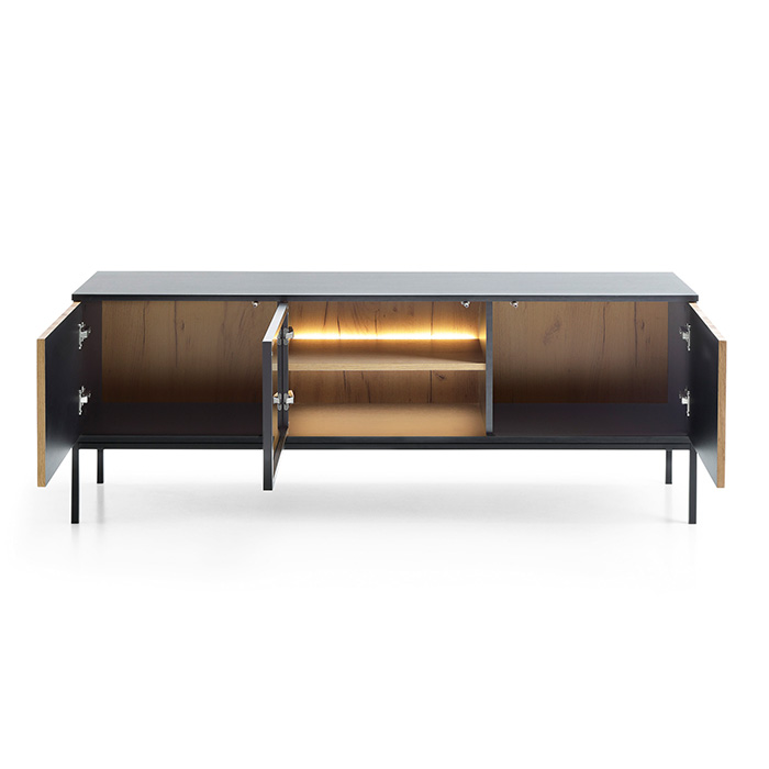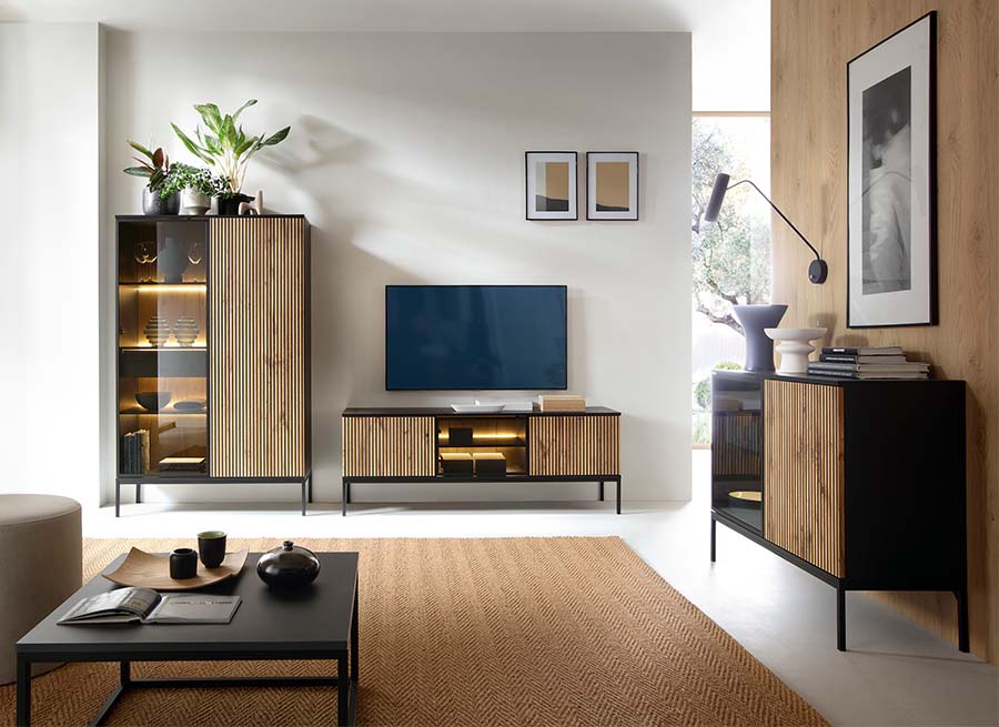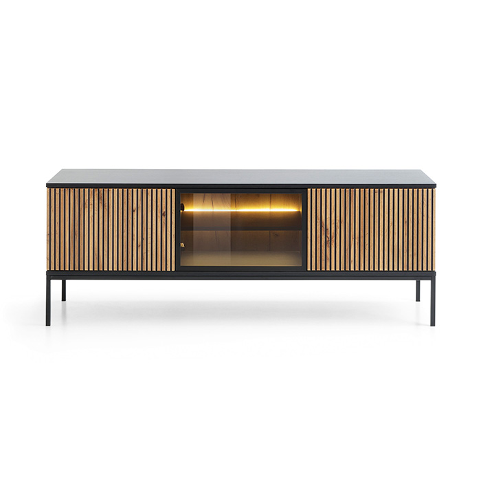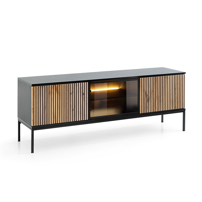Móvel TV Carvalho com Ripas em Preto e Leds Sento