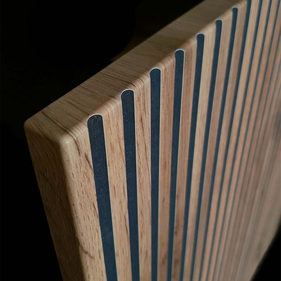 O design é caracterizado por painéis frontais com ripas verticais em carvalho, intercaladas por espaços em vidro transparente, permitindo vislumbrar o interior iluminado por LEDs, que adicionam um toque quente e acolhedor.