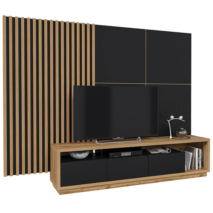 Móvel para TV com Painel Laminado Ripado e três gavetas. Um móvel de tv para sala de estar de design vanguardista, com um painel de parede ripado.