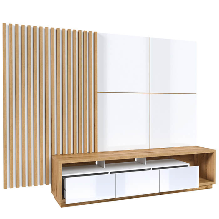 Móvel para TV com Painel Laminado Ripado e três gavetas. Um móvel de tv para sala de estar de design vanguardista, com um painel de parede ripado.