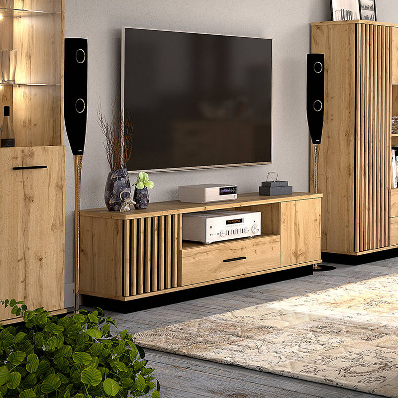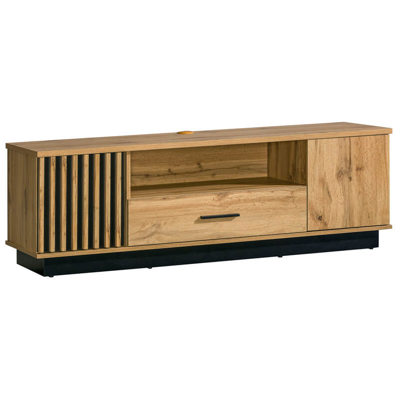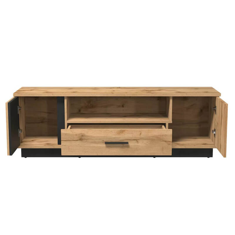 Móvel para TV espaçoso, moderno e perfeitamente equipado com duas portas, compartimentos fechados, uma gaveta e uma secção aberta na frente que pode preencher com os seus dispositivos de média favoritos.