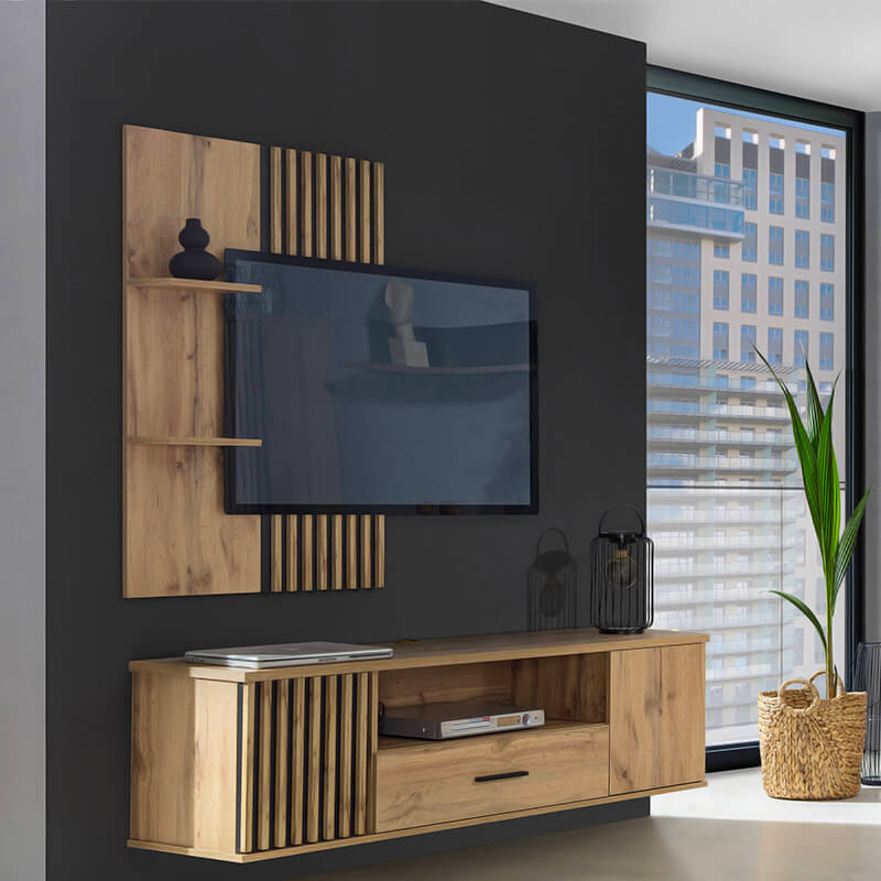 Experimente o melhor do design moderno com o painel de parede Lamelo. Elegante e cuidadosamente trabalhado a partir de placa laminada premium e acabada num belo tom de carvalho Wotan com um contraste de preto fosco.