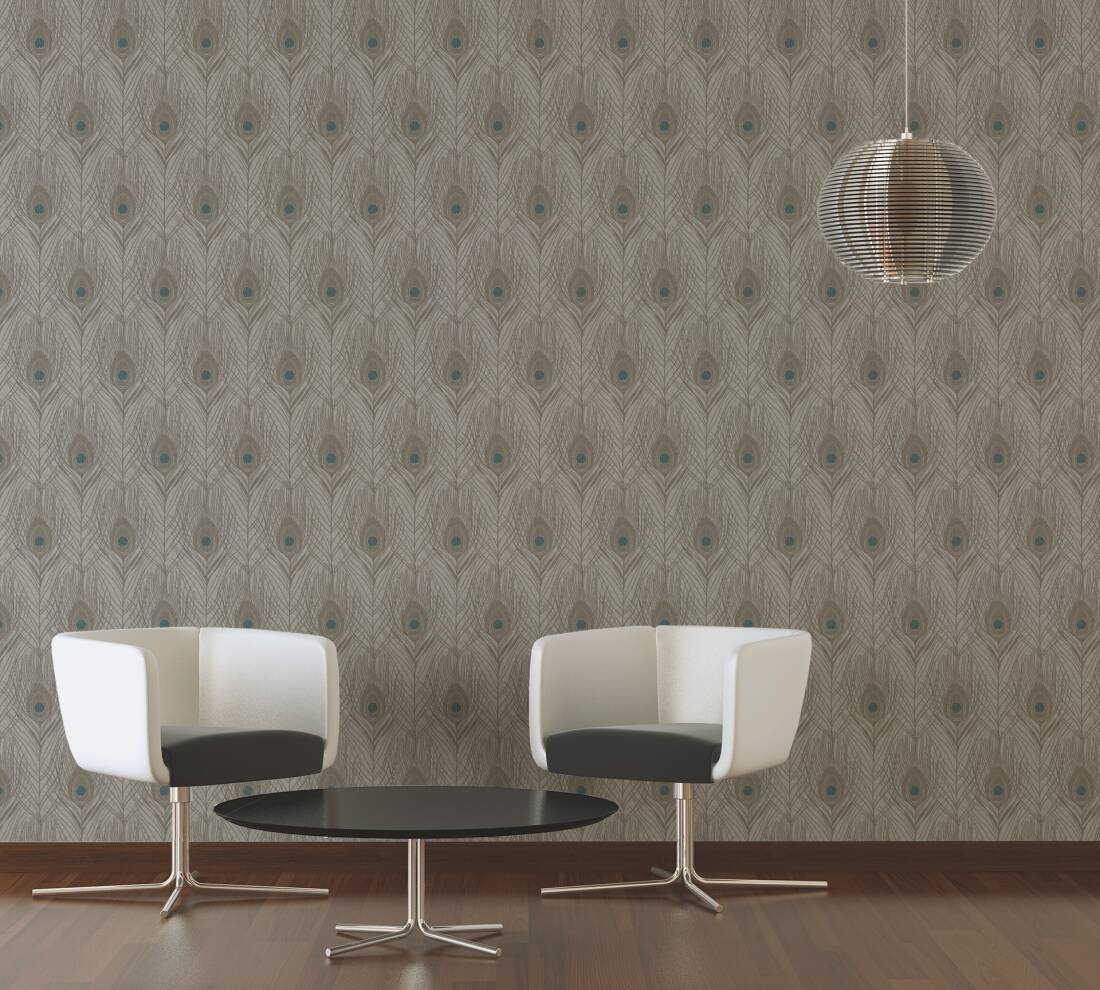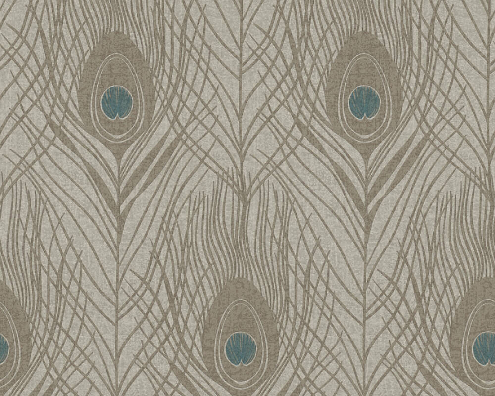 Esta proposta da Absolutely Chic apresenta um design com motivo de penas de pavão, mostrado aqui em tons de azul, castanho e cinzento.