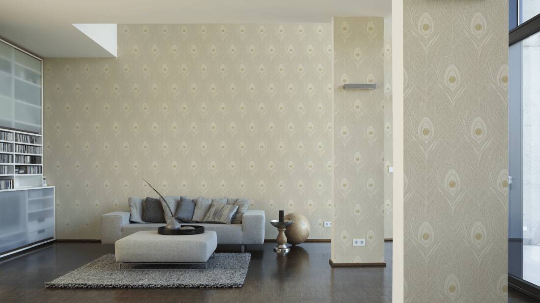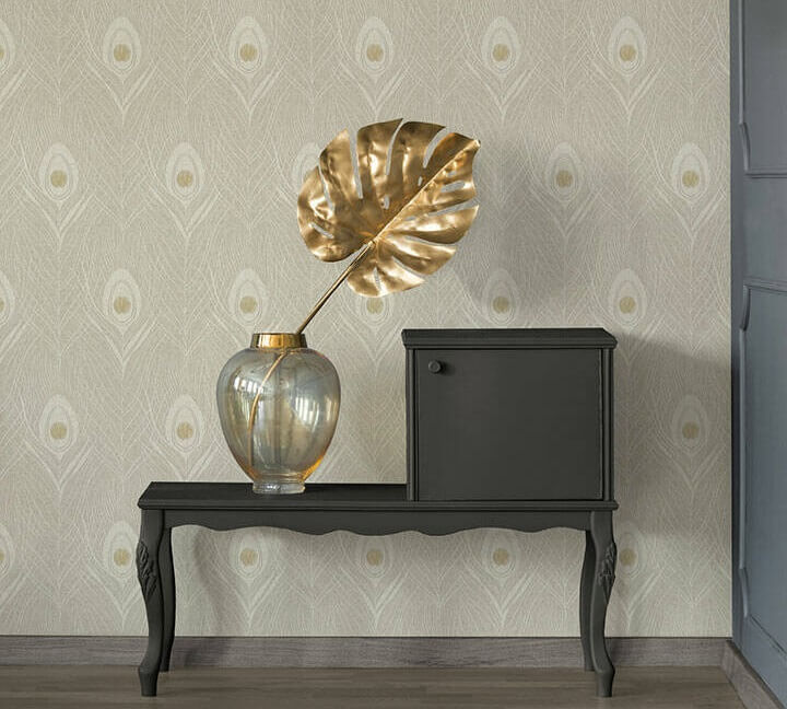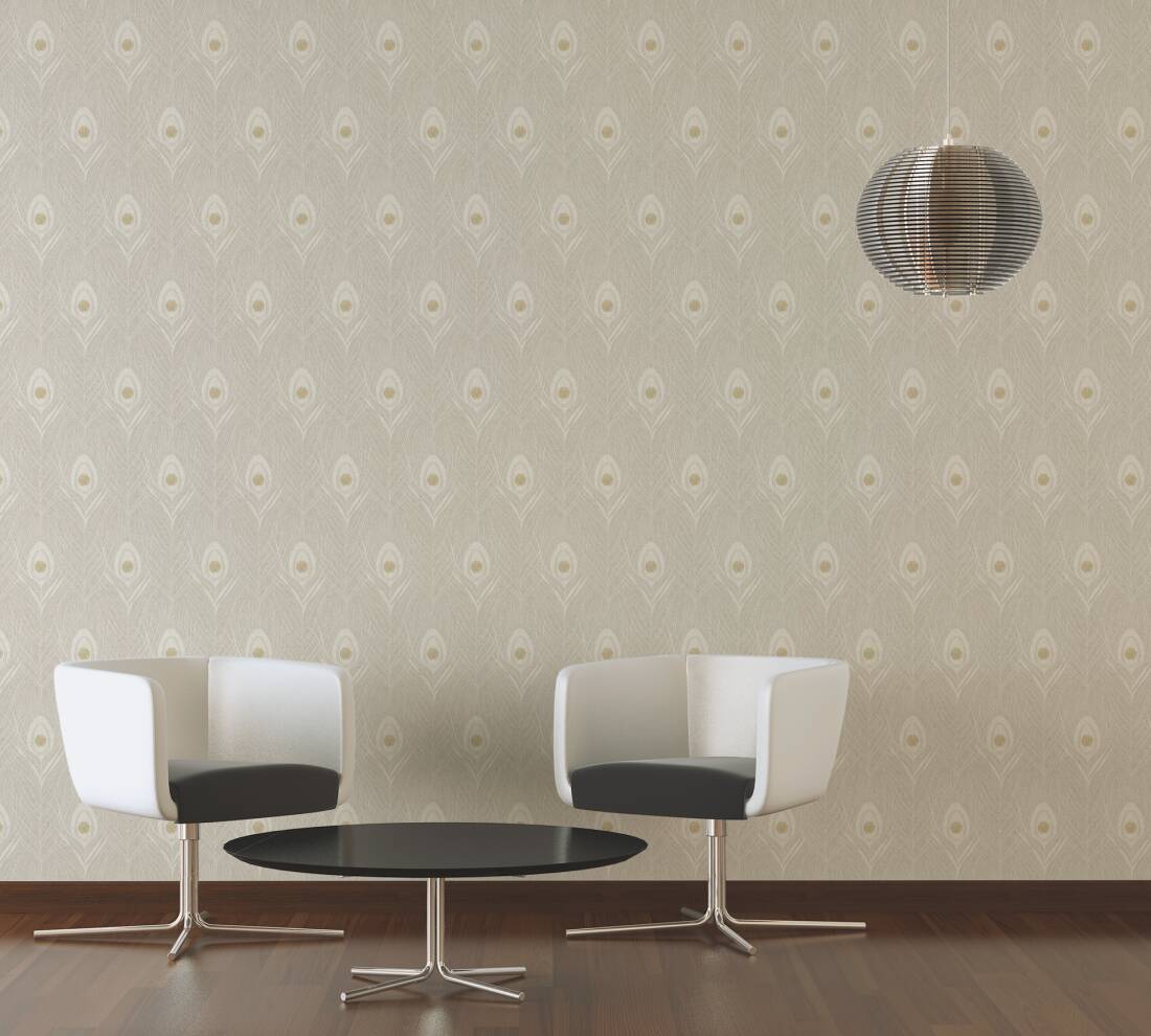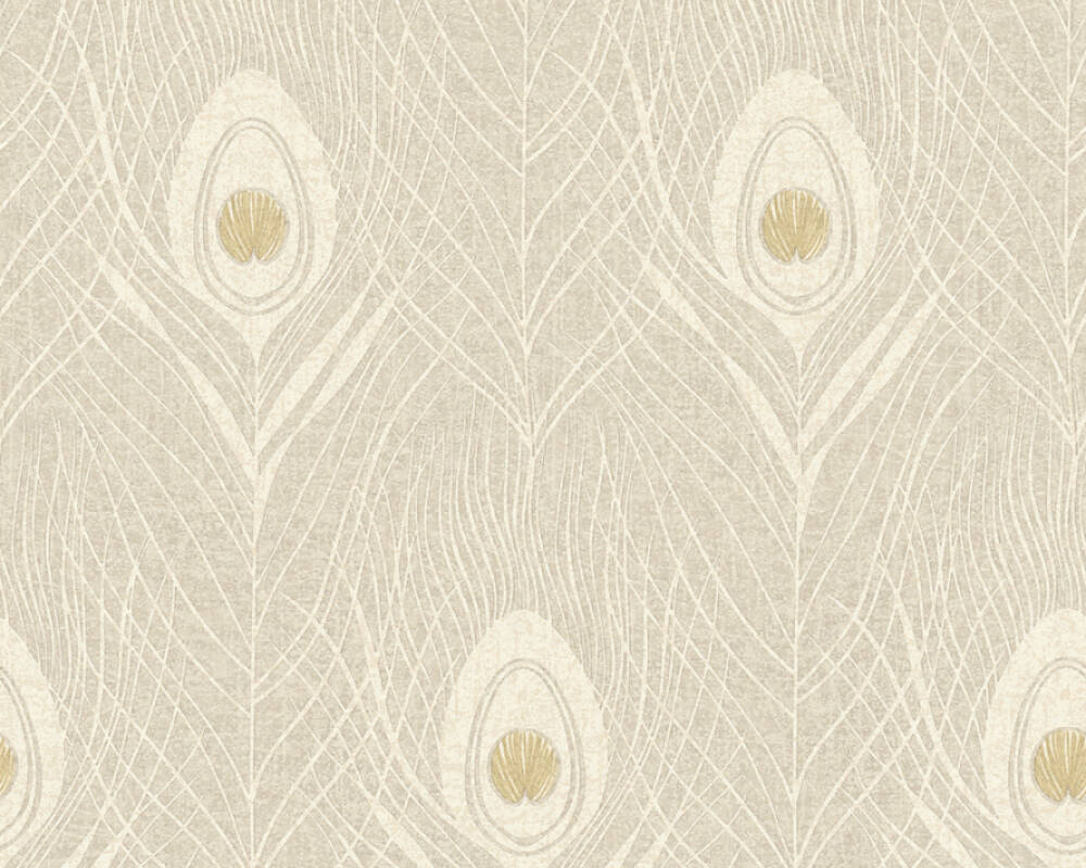 Esta proposta da Absolutely Chic apresenta um motivo em estilo penas de pavão, mostrado aqui em tons de bege, dourado, cinza, metálico e taupe.