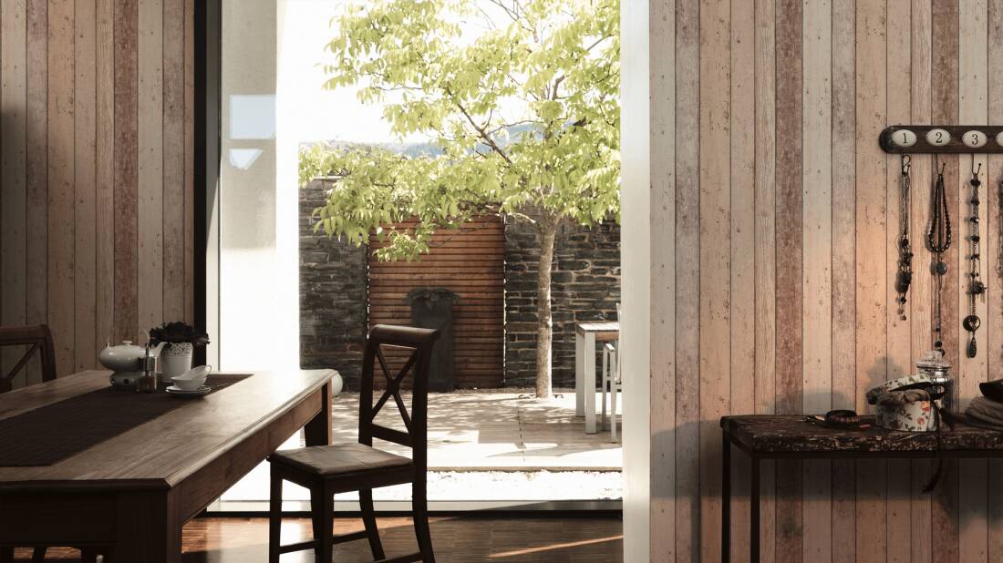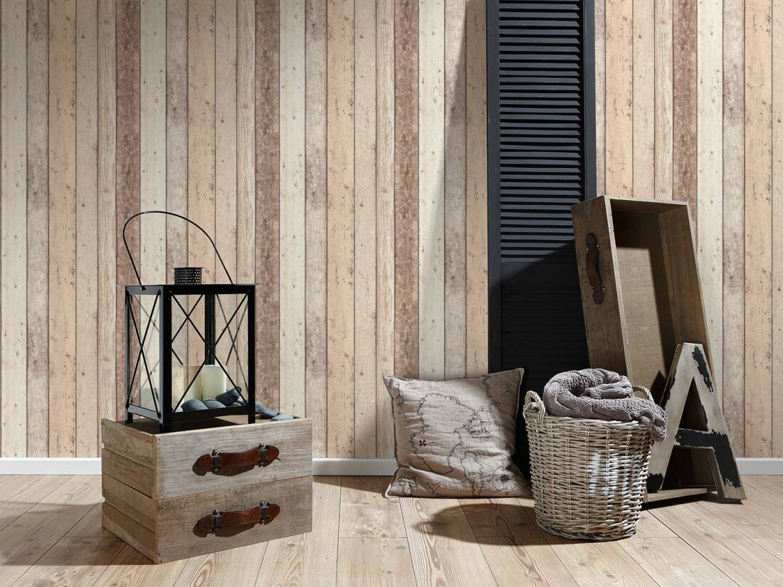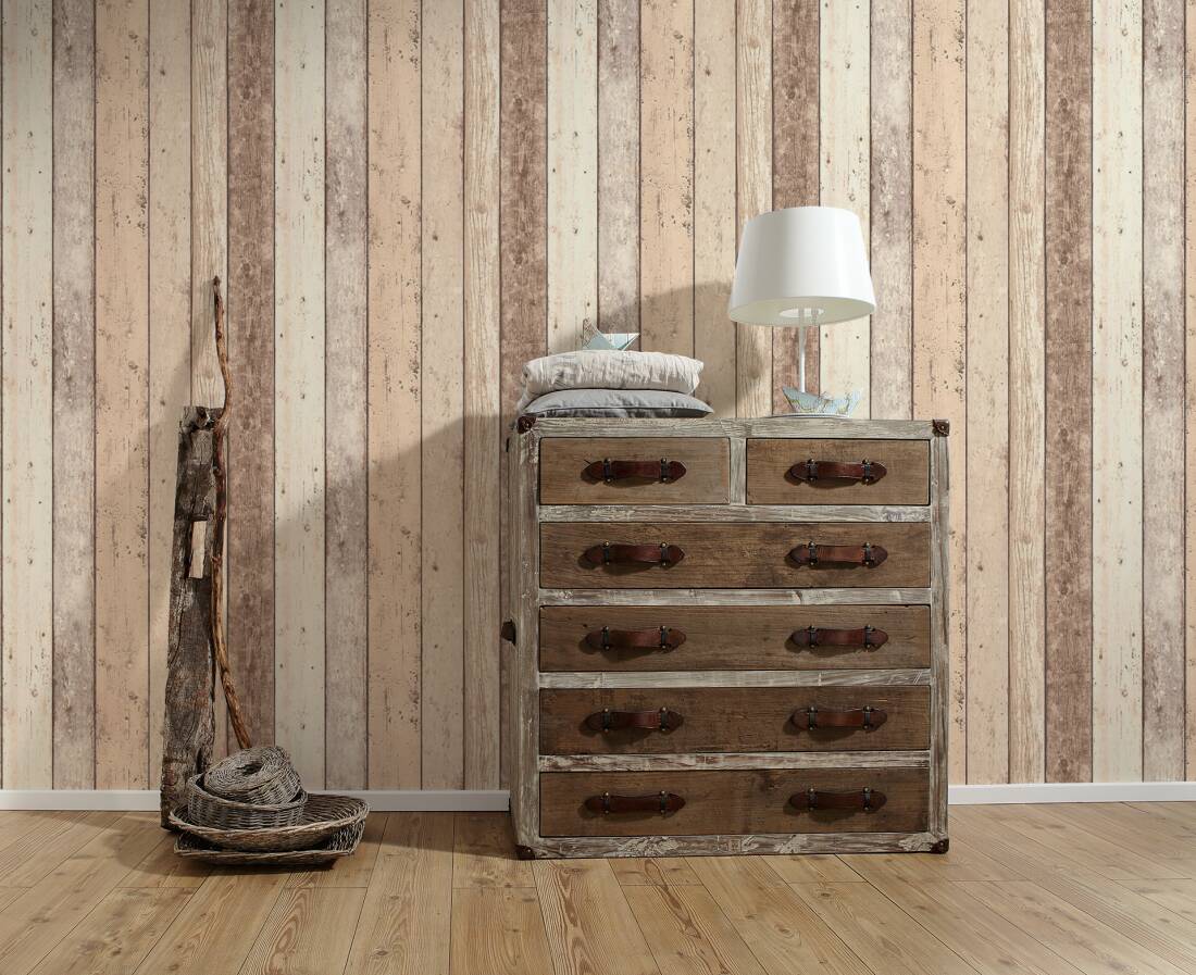 Proposta de Papel de Parede estilo Madeira, Casa de Campo, Bege, Castanho, Branco.