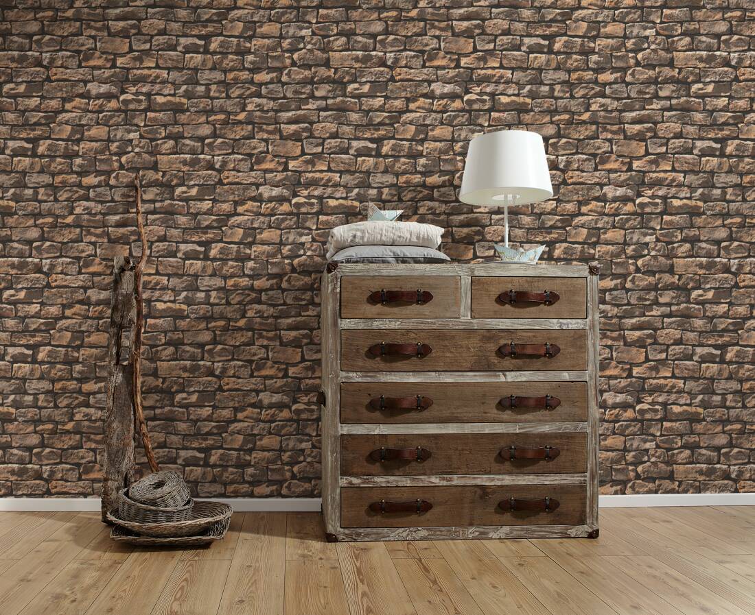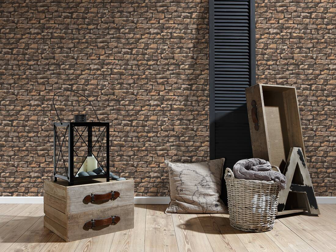 Proposta de Papel de Parede estilo Pedra, Casa de Campo, Bege, Preto, Castanho.