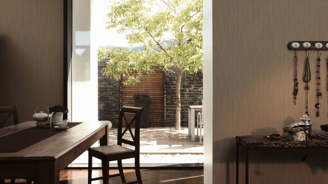 Esta proposta com tema floral da Ilha de Sumatra que apresenta um papel de parede estilo Tropical, Folhas, Uni, Castanho, Dourado, Metálico.