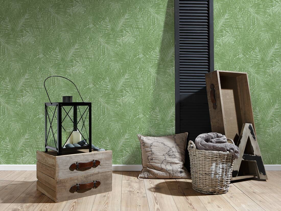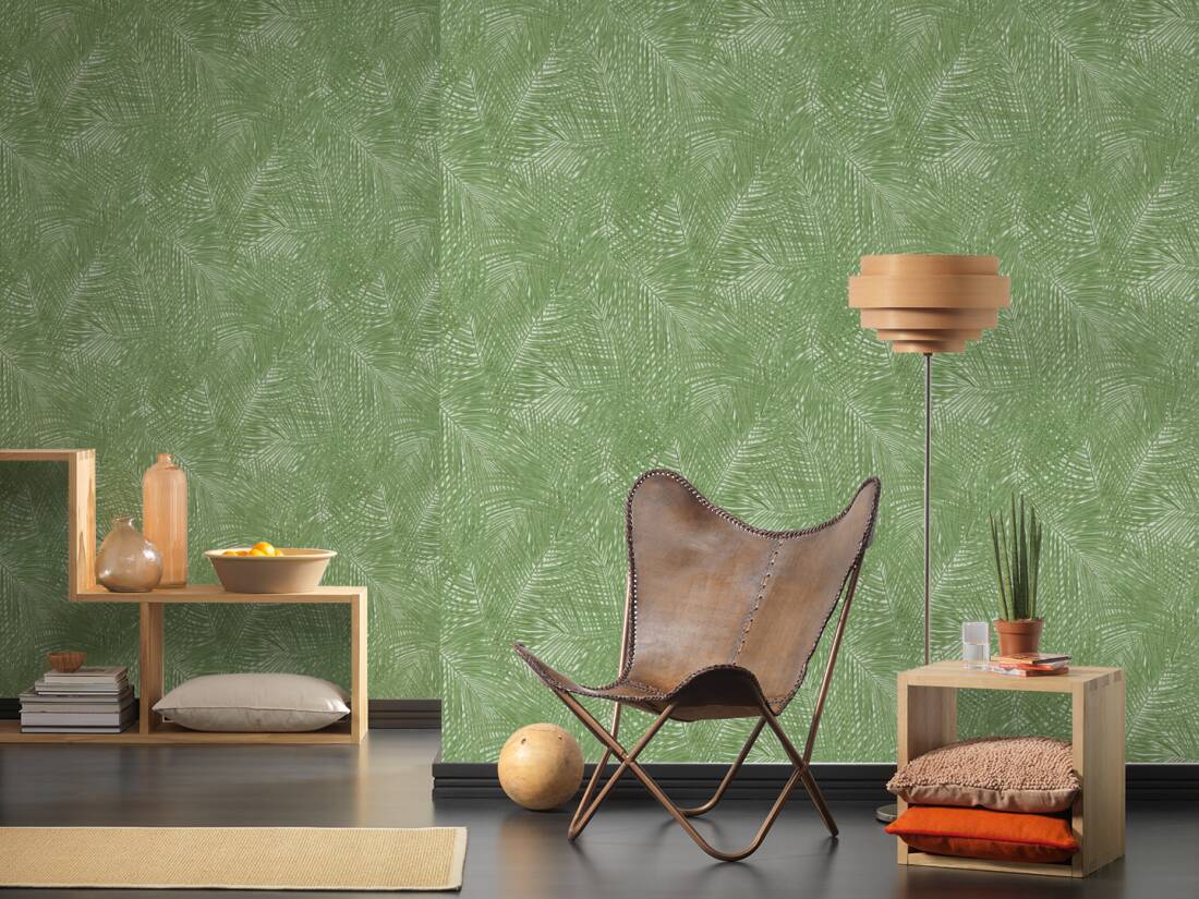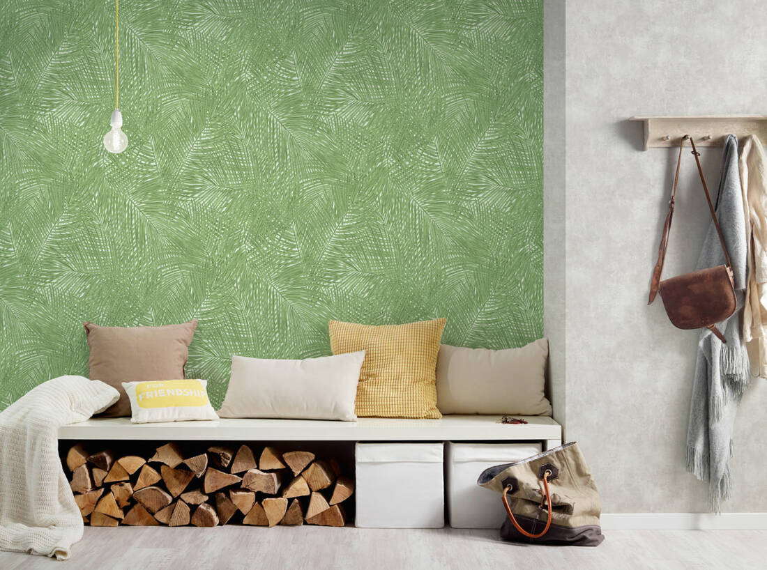 Estilize o seu papel de parede tropical chic escolhido com plantas de interior para adicionar profundidade e completar o visual.
