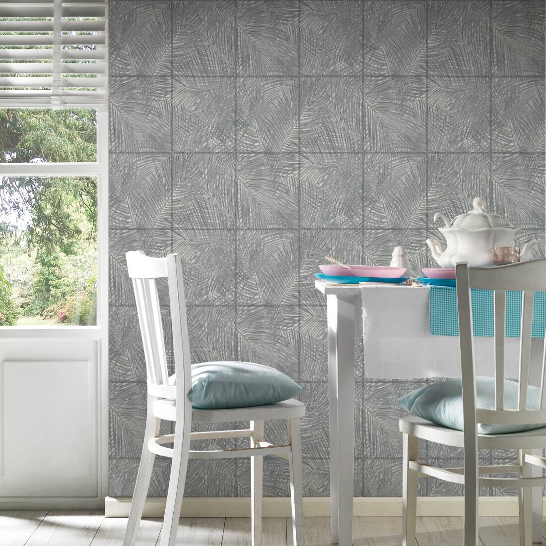 Estilize o seu papel de parede tropical chic escolhido com plantas de interior para adicionar profundidade e completar o visual.