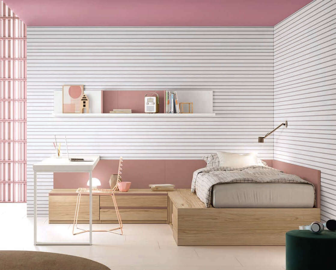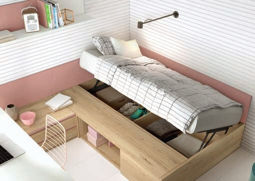 Um quarto juvenil pequeno com design prático. Inclui a cama com armazenamento, mesa de cabeceira e área de estudo.