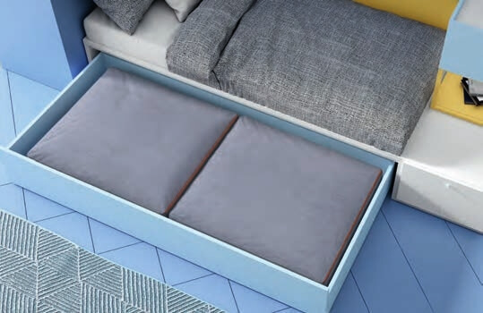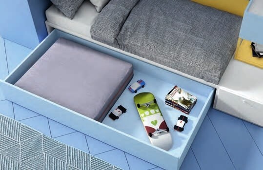 Espaço fresco e jovem. A cama possui uma gaveta grande que pode ser utilizada como arrumação ou, simplesmente, adicionando um colchão, como cama adicional.