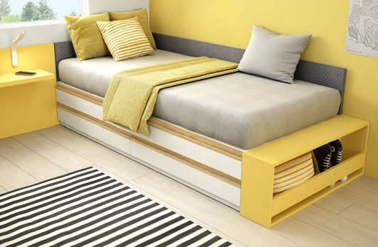 Quarto juvenil moderno em tons Amarelo e Branco projetado para fornecer um espaço central para brincar.