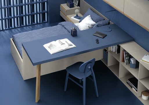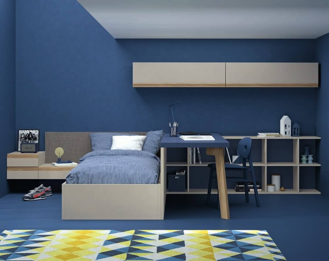 Quarto Juvenil em tons de Azul, Creme e Cinzentos combinados com tecido. Dois ambientes no mesmo espaço.